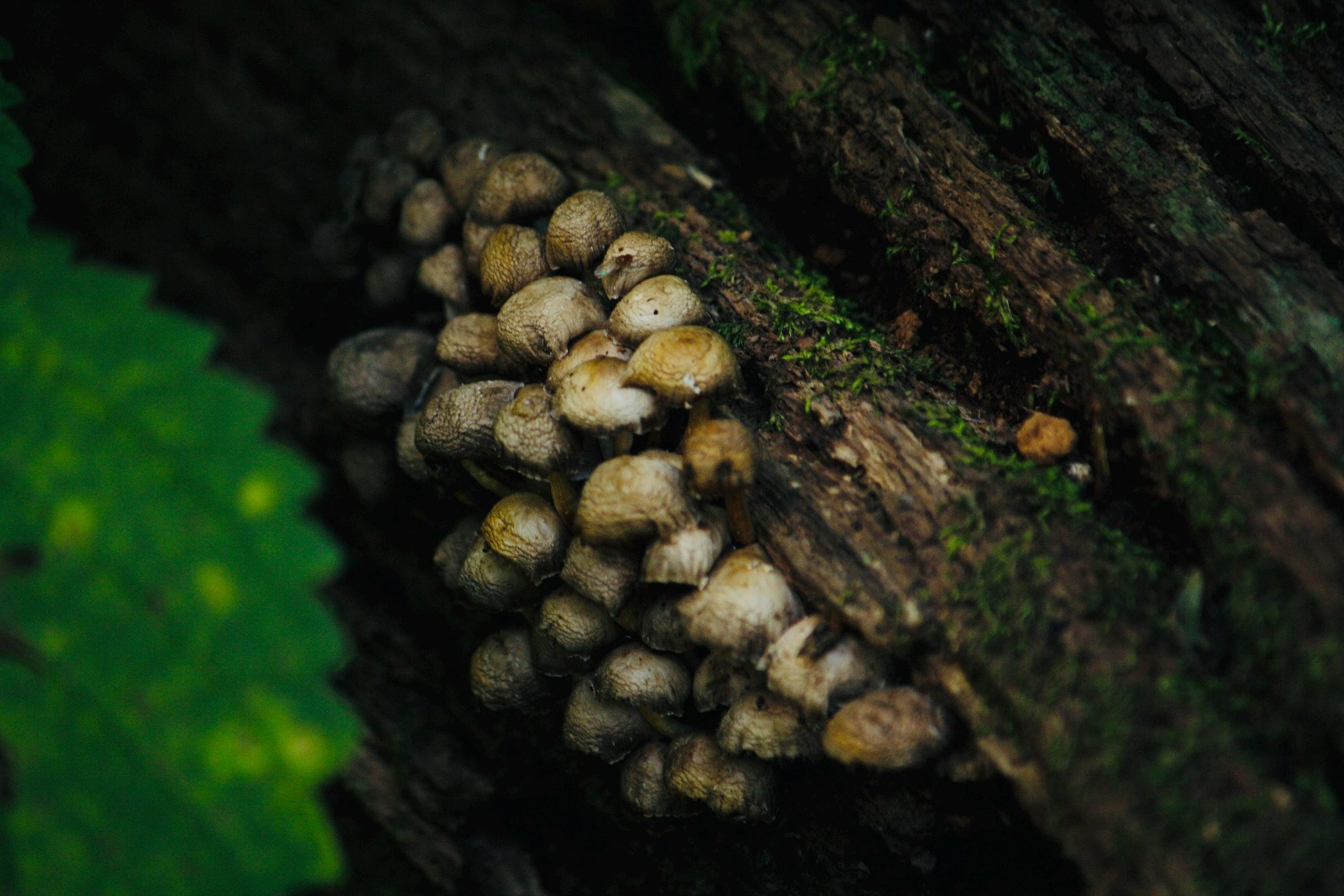 ~11x14 photographic print of small brown mushrooms growing on a dead tree stump.