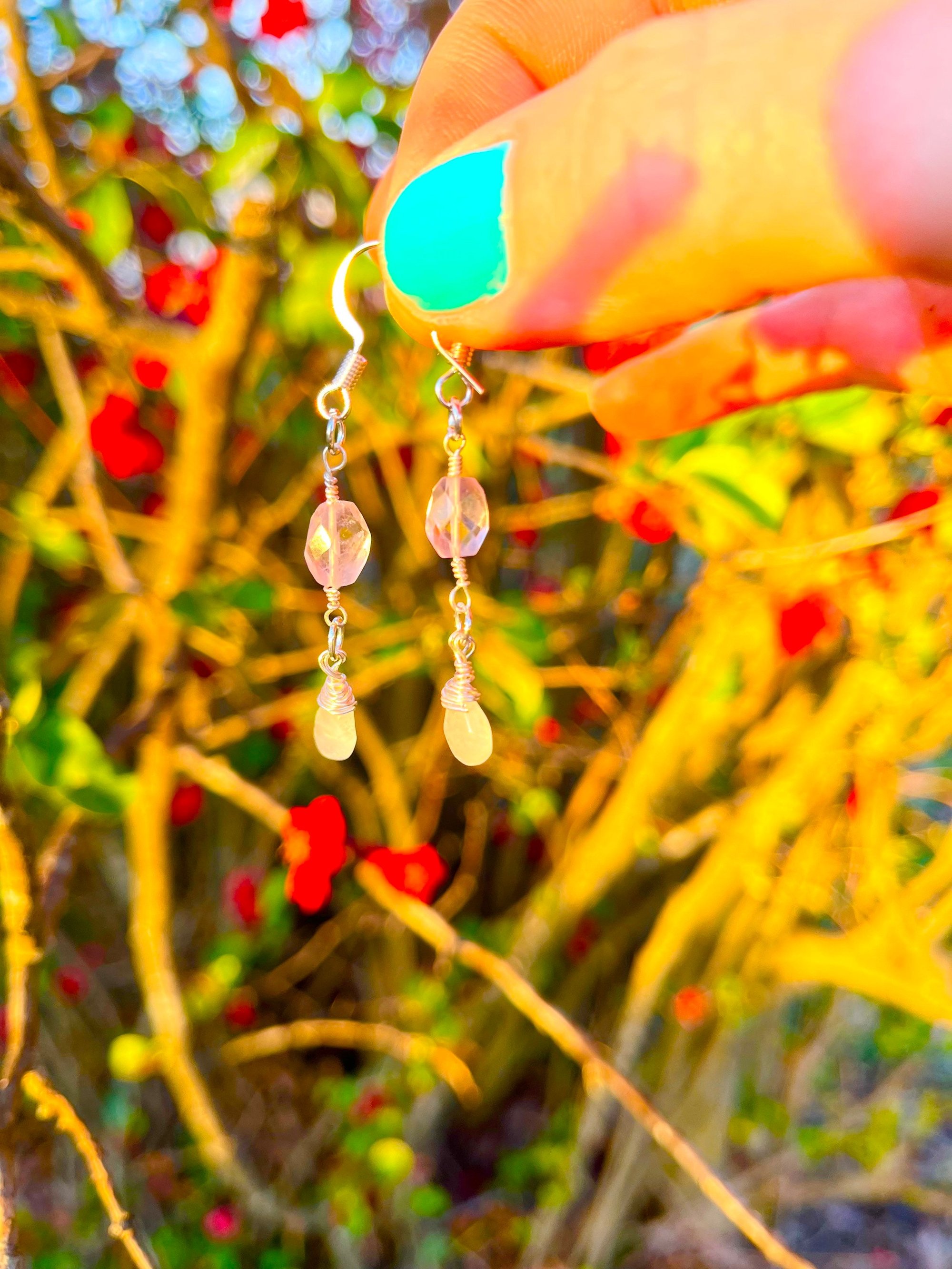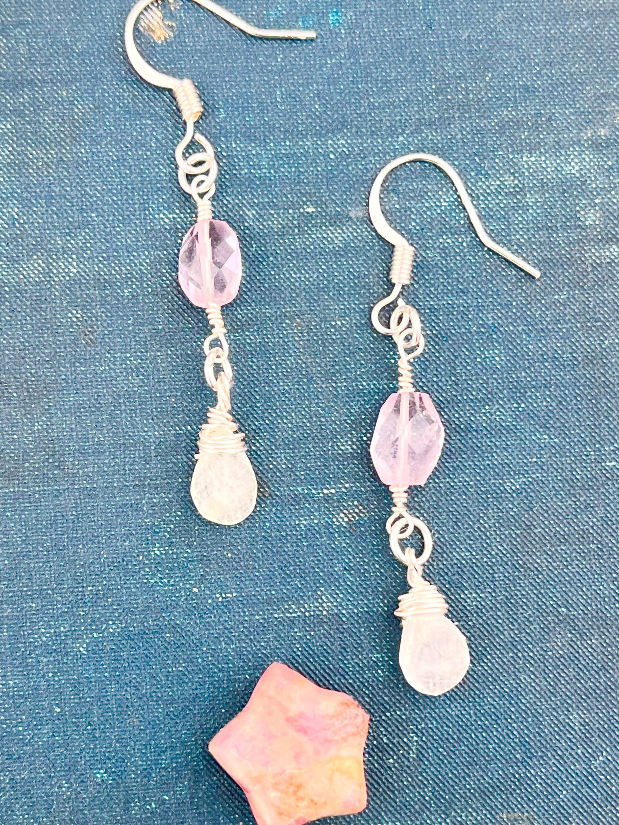 These small dangly earrings are made with amethyst and aquamarine stones. The wire is sterling silver and the rest of the metal pieces are silver plated. They measure 1 inch each and come to you gift wrapped. They are extremely light weight.