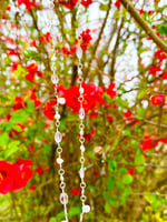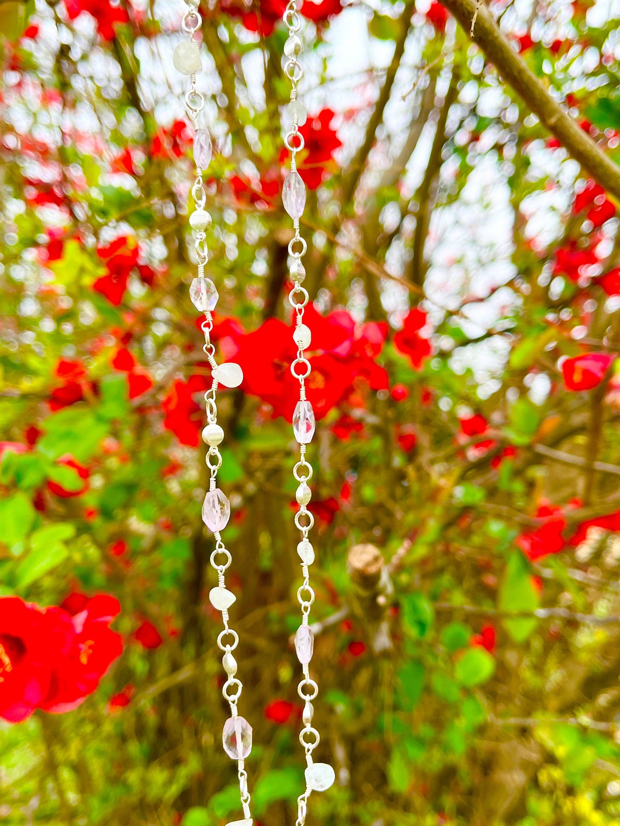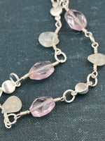 This necklace is made with purple amethyst and light blue aquamarine stones wire wrapped in silver plated wire. It measures 20 inches long and closes with a lobster clasp. It also has tiny circular silver links in between each stone and silver o rings. The necklace comes to you gift wrapped. It’s great for layering or for simply wearing it by itself.