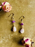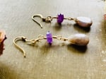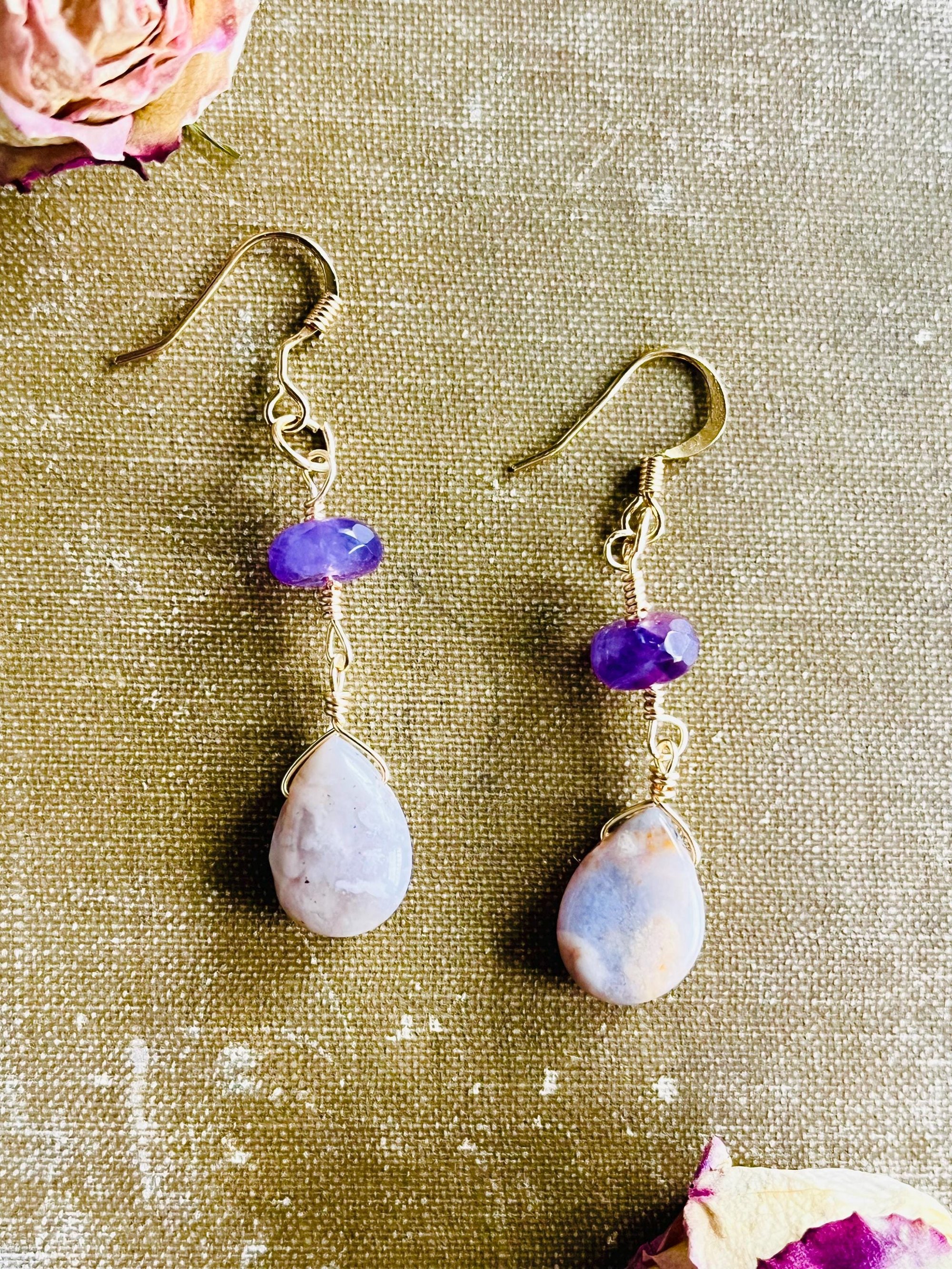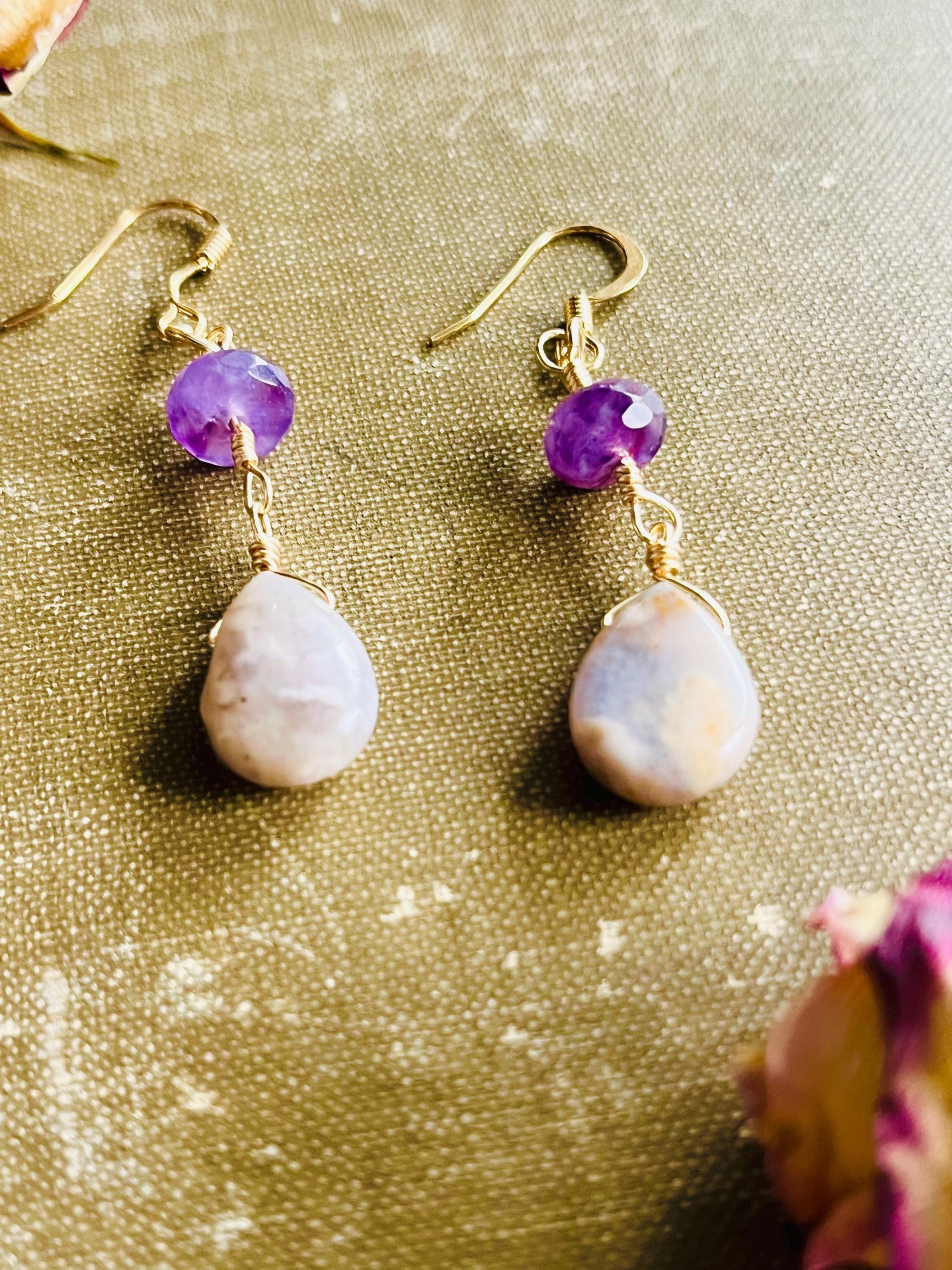 ~made from dark purple amethyst with light purple sage amethyst at the bottom and wrapped with gold toned wire and gold filled ear wires.