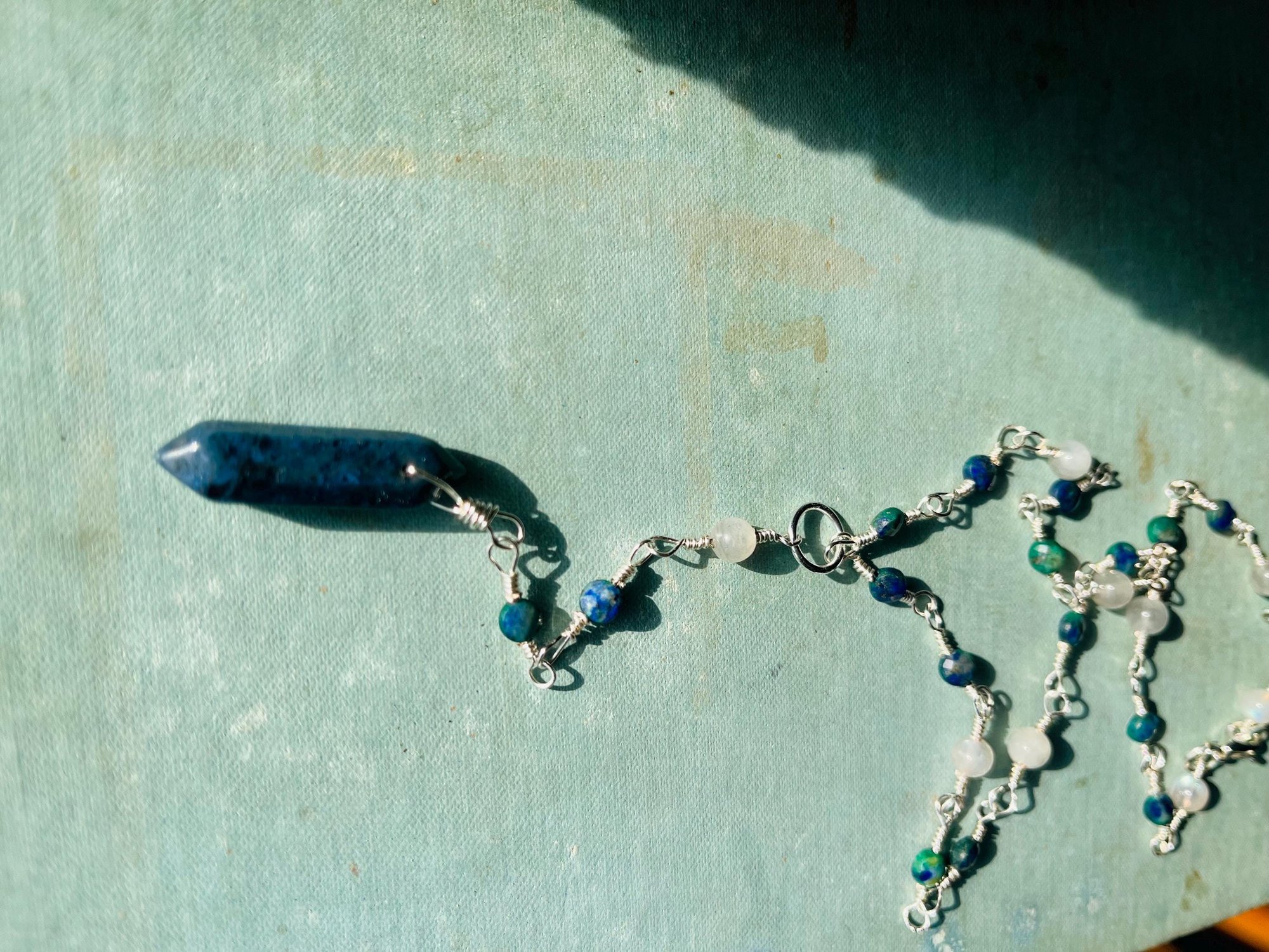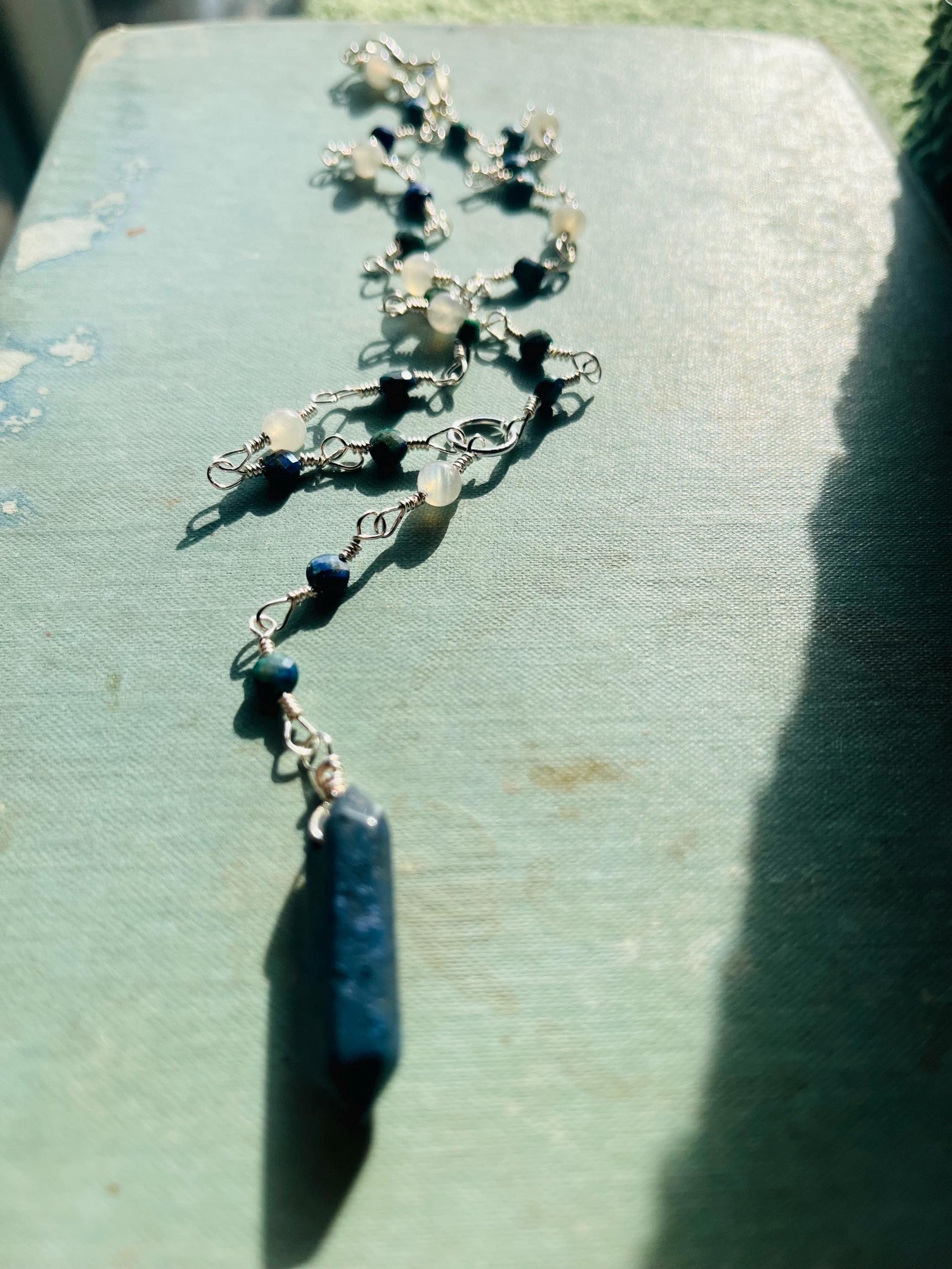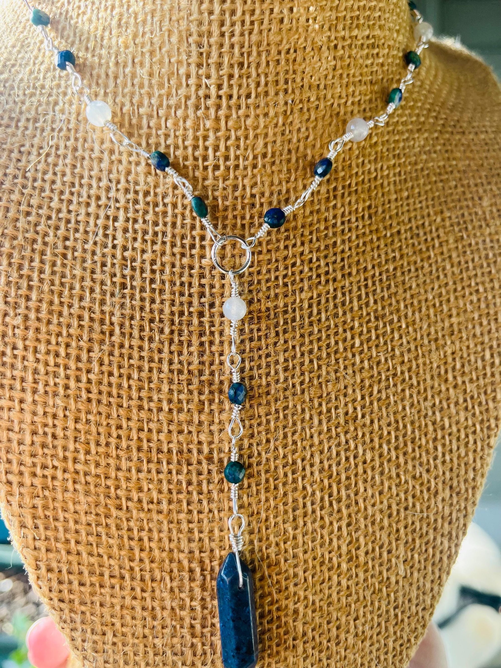 ~made with lapis lazuli, azurite, labradorite, and tarnish free silver plated wire.