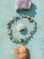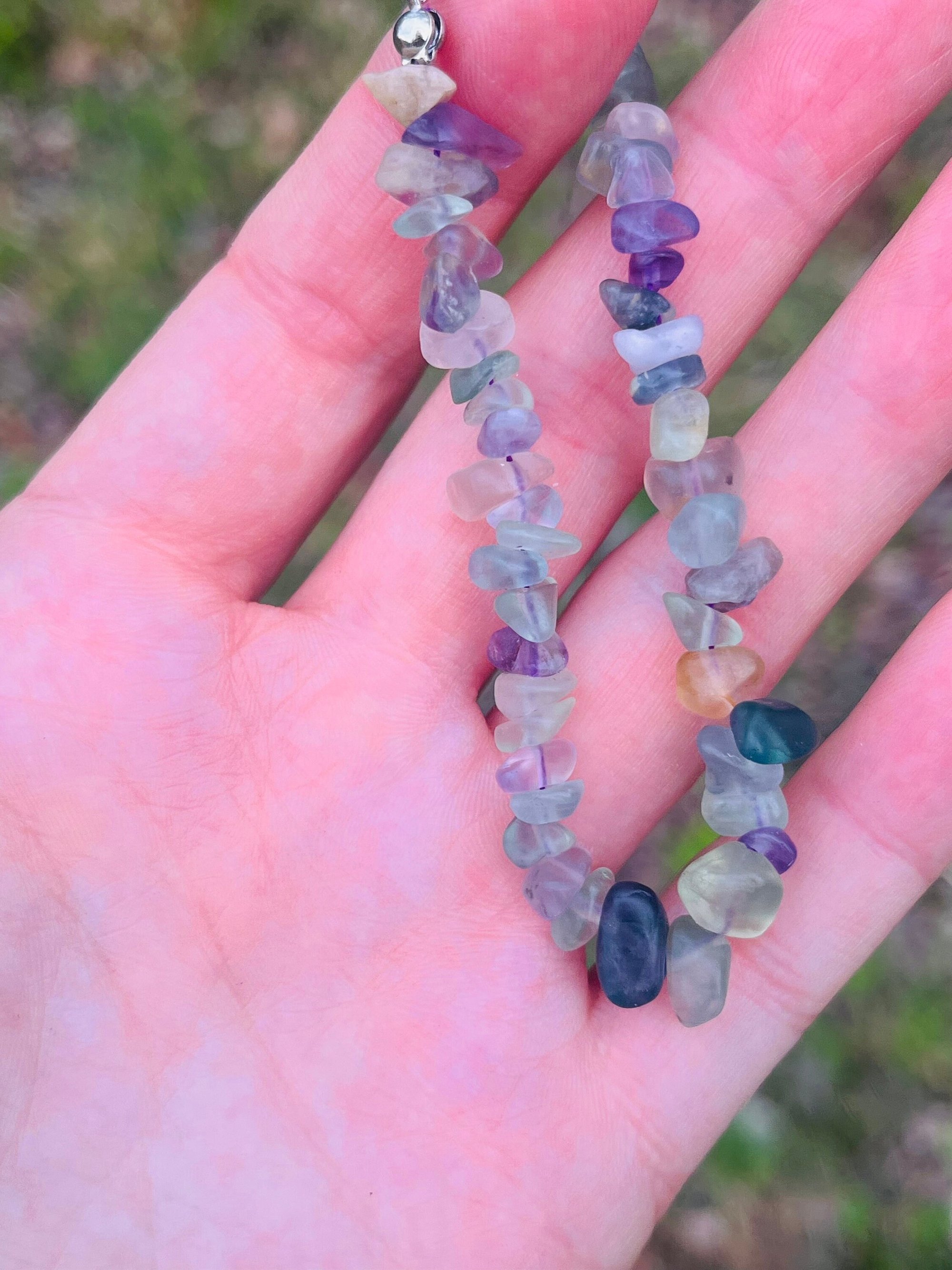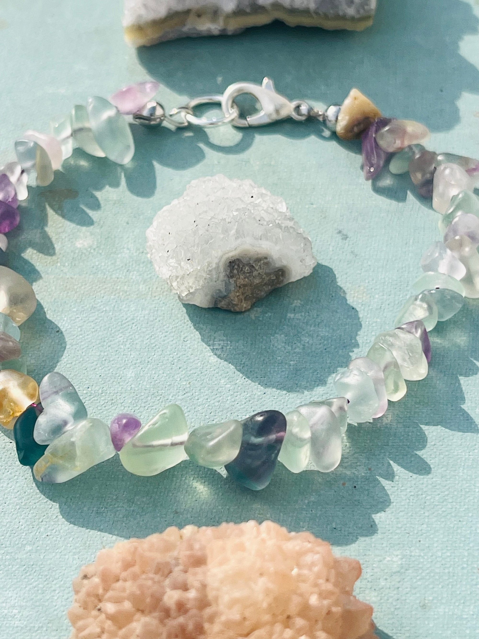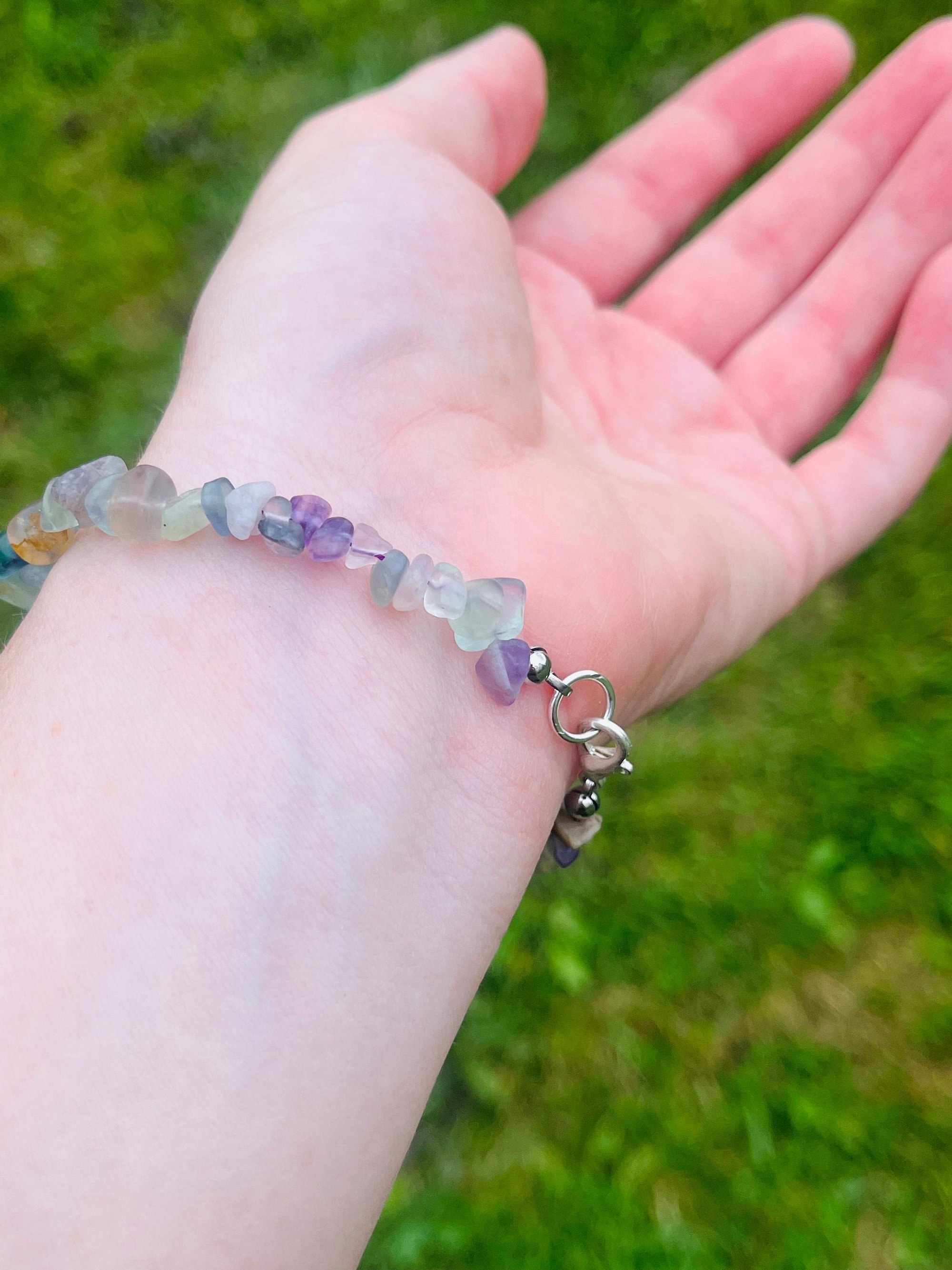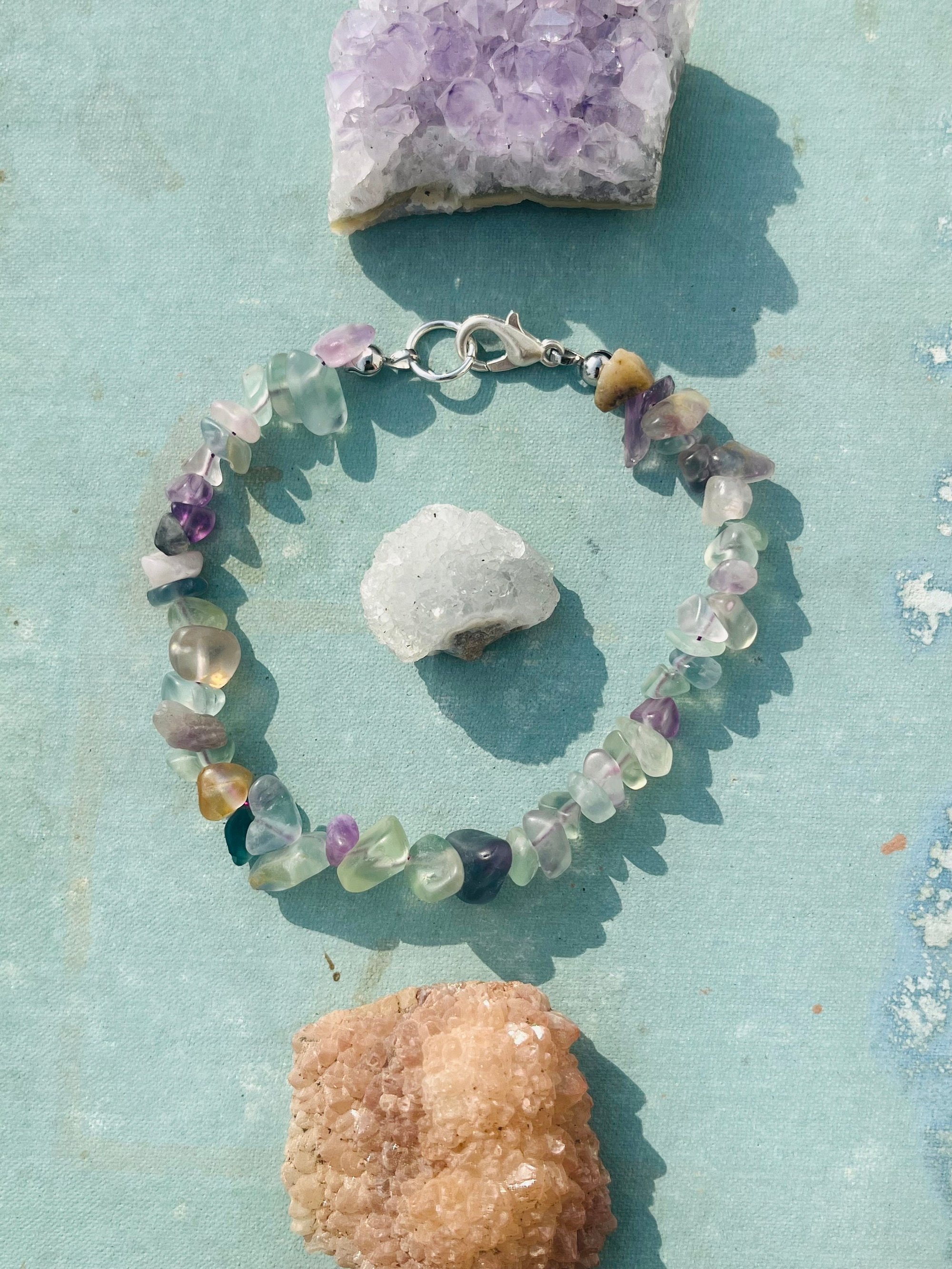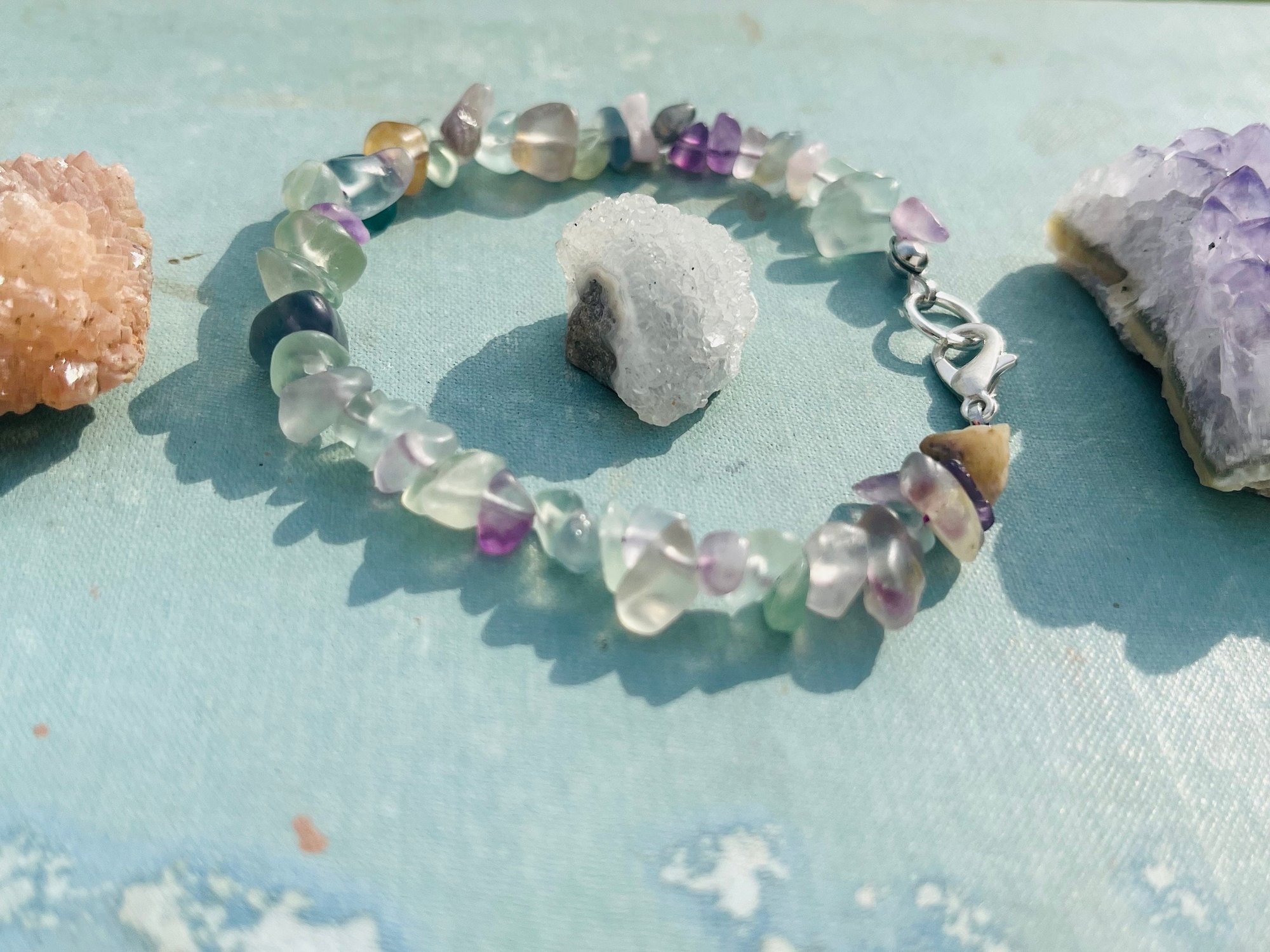 This beaded bracelet is made with multi-colored fluorite stones in purple, green, and clear. It measures 6 inches long and closes with a lobster clasp. It comes to you gift wrapped!