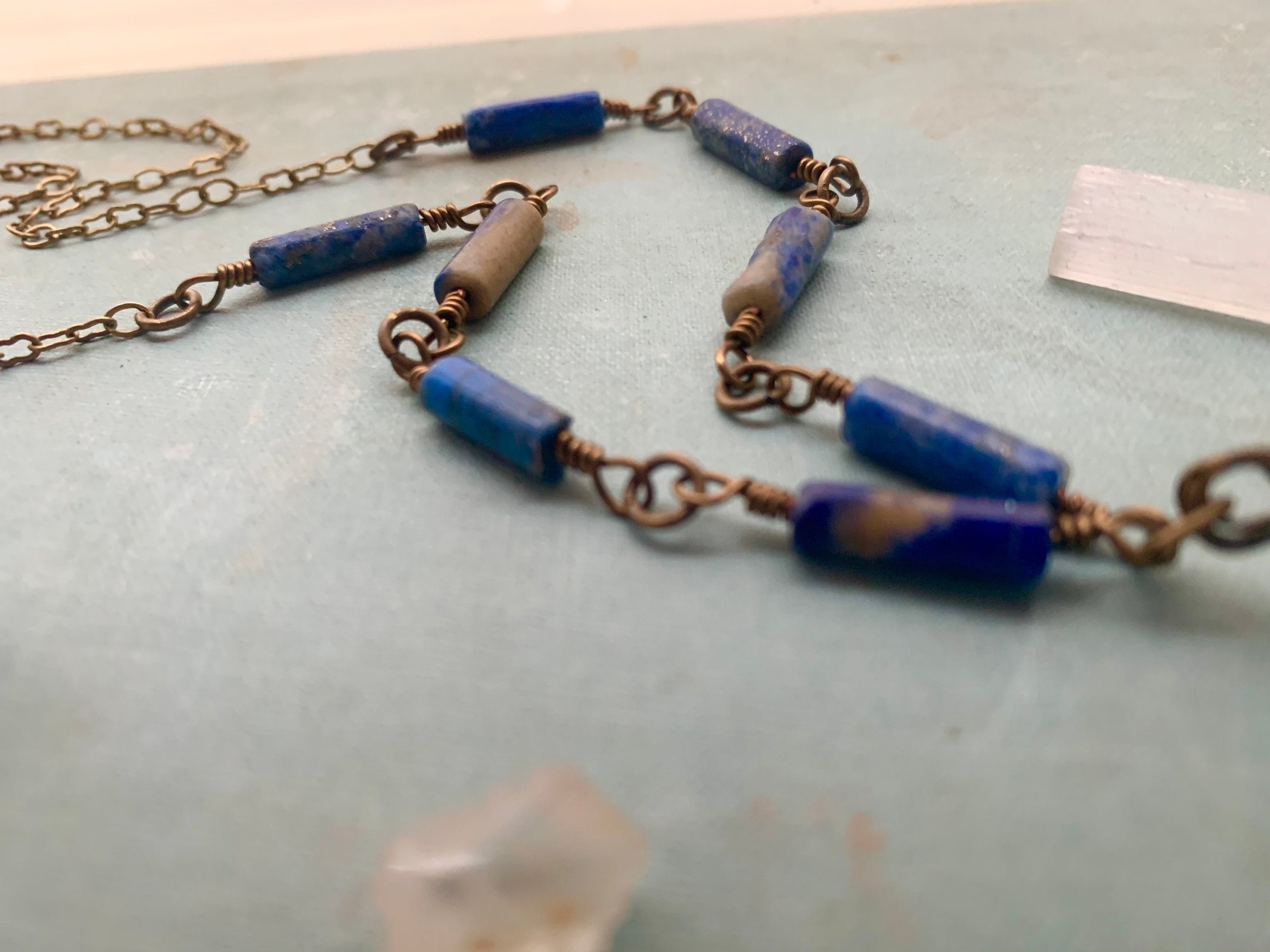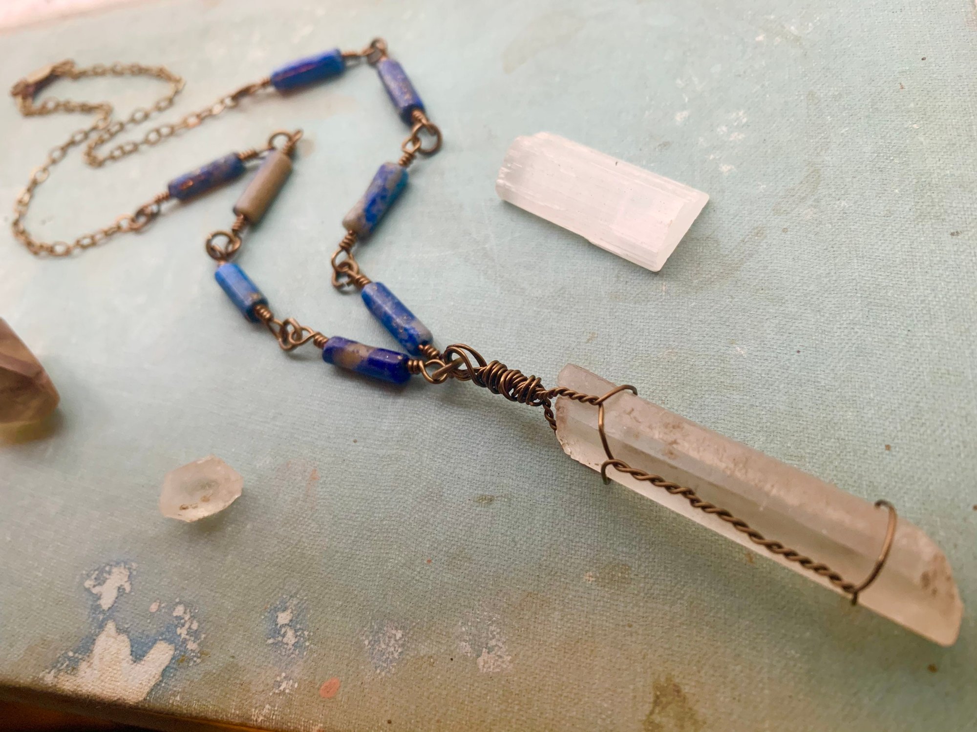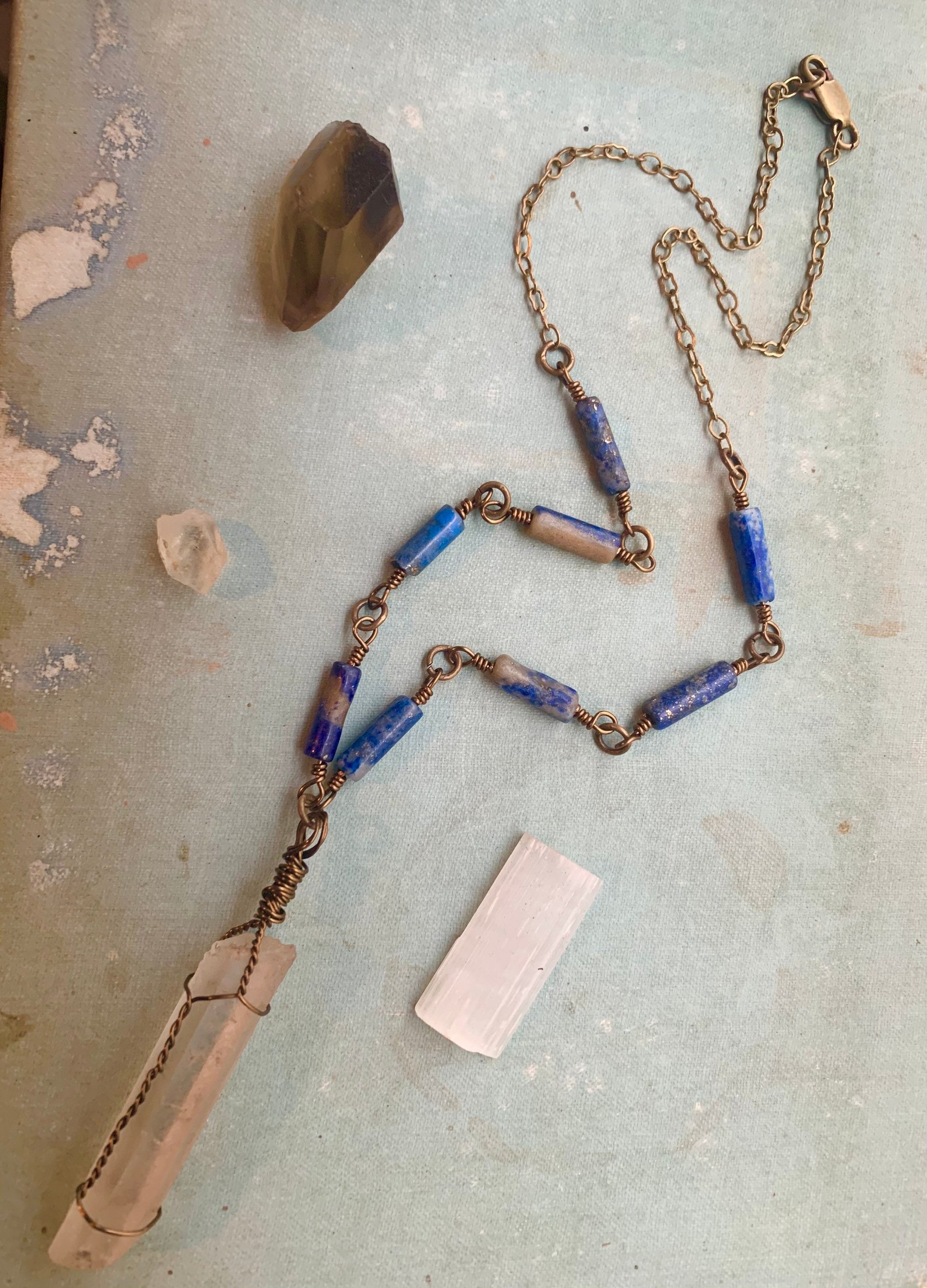 This necklace is made with an antique brass wire wrapped crystal centerpiece with lapis stones wire wrapped around it. It measures 18 inches and closes with a lobster clasp.