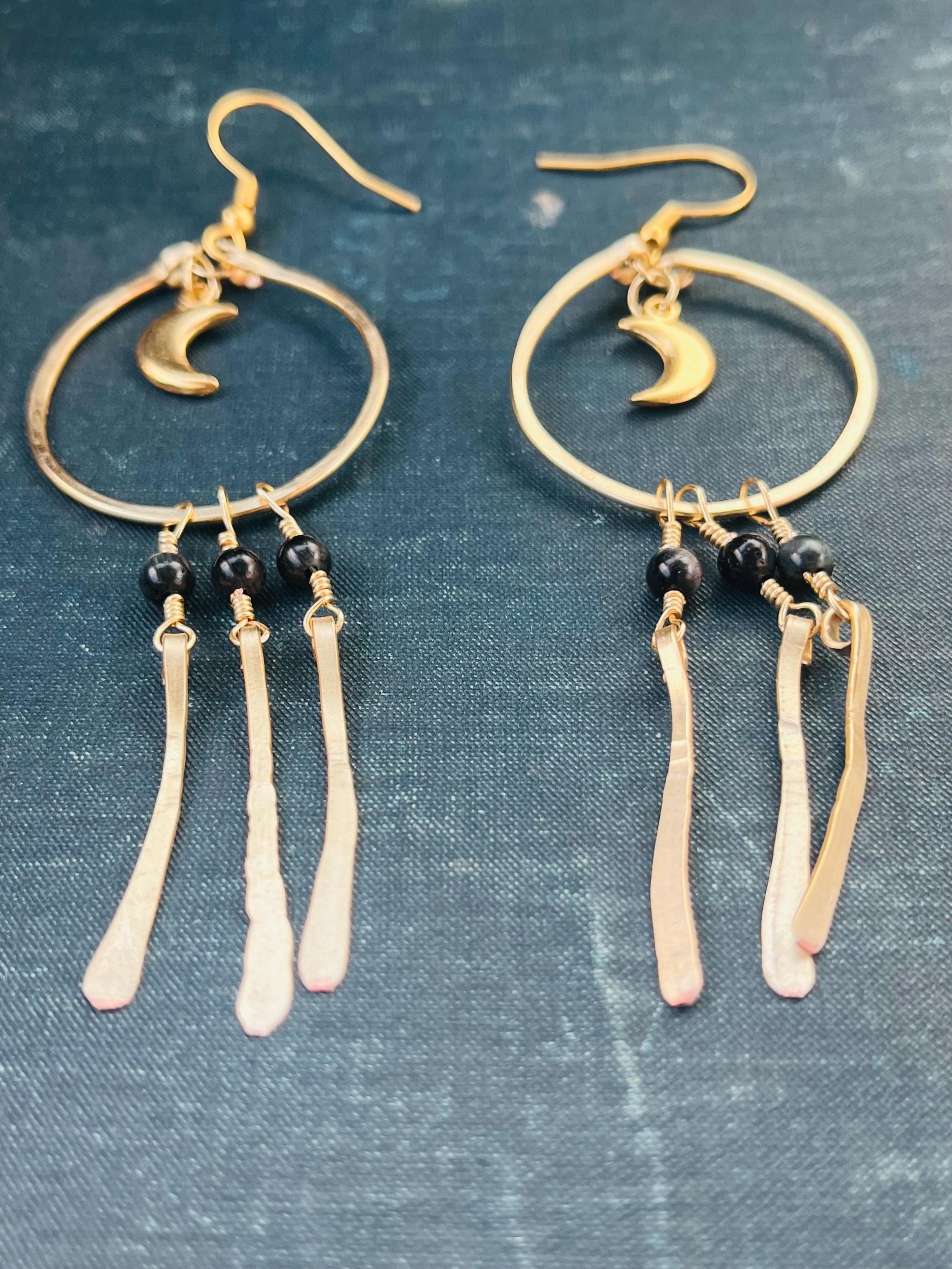 These dangly hoop earrings are made with gold toned wire, which has been hammered at the bottom. The crescent moon is gold plated and the tiny blue stones are lapis lazuli. These earrings are one of a kind and very lightweight. The earrings hooks are gold plated as well. They measure 3 inches each and come to you gift wrapped.
