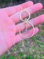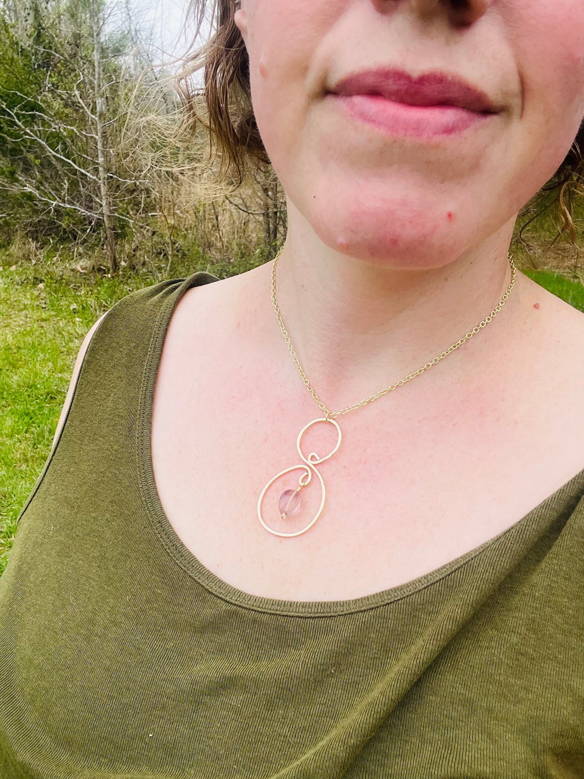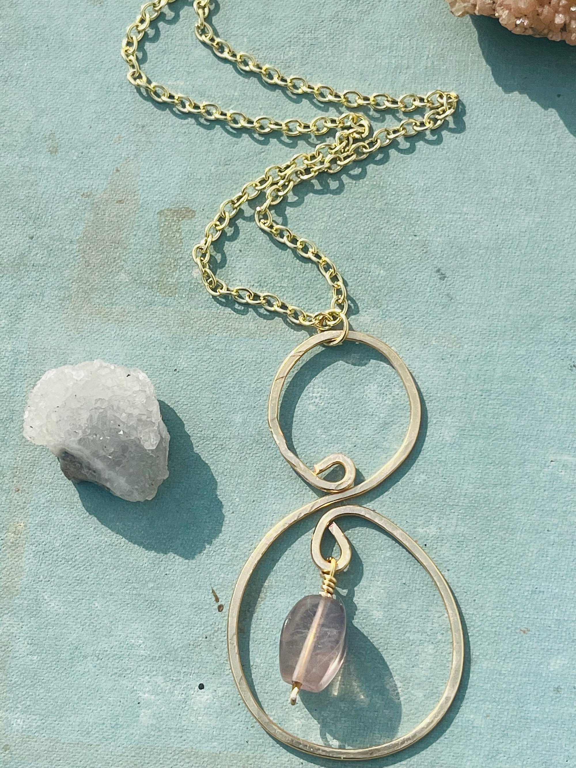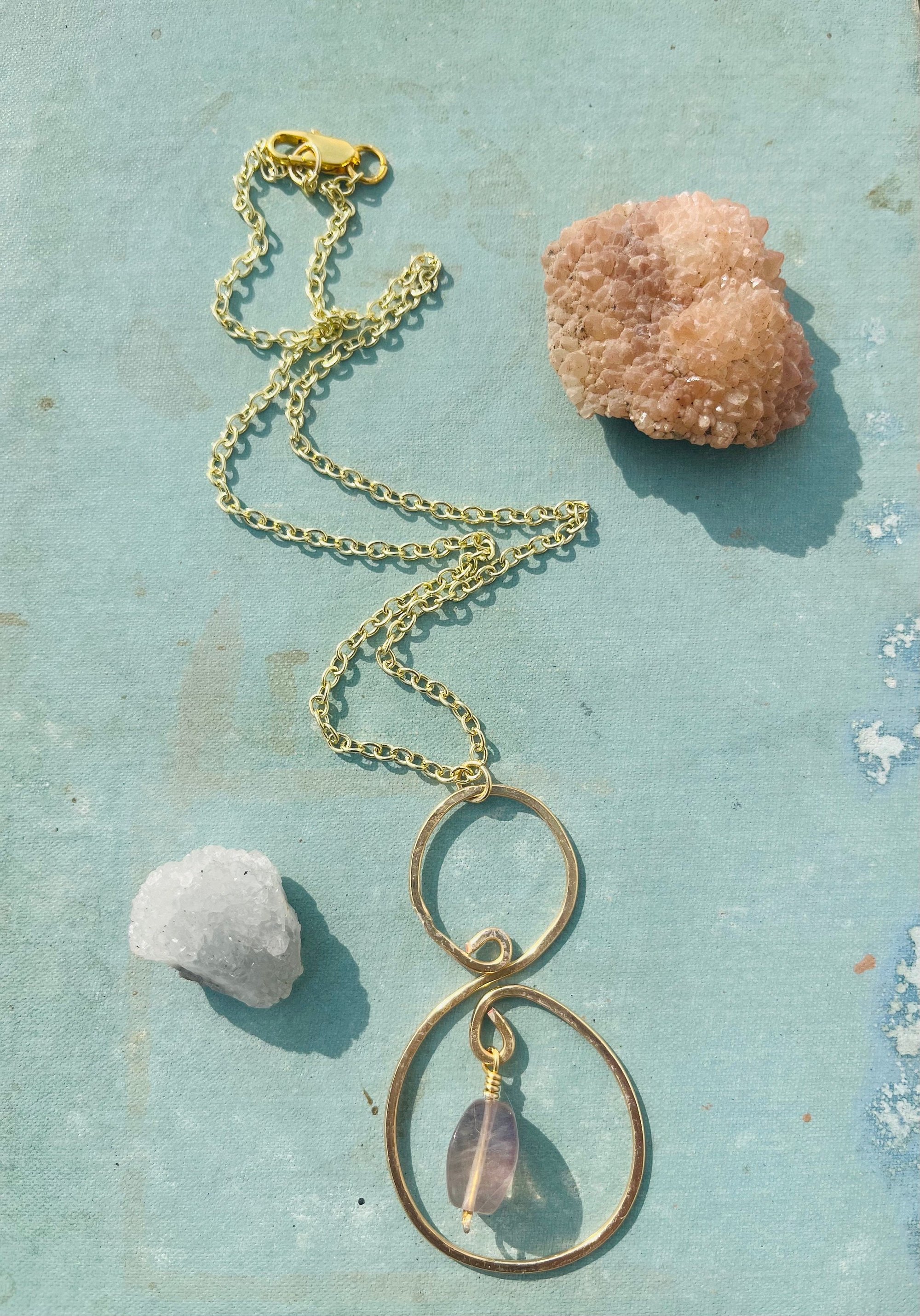 This hammered gold centerpiece is made with gold toned wire and a small light purple fluorite stone. The center piece measures 2 inches and the chain measures 15 inches and closes with a lobster clasp. It comes to you gift wrapped!