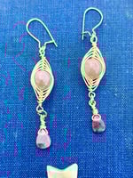 These gold dangly earrings are made from sunstone wire wrapped in gold toned wire with tiny tourmaline drops at the bottom. They measure 2 inches each and are on gold filled ear wires.