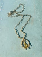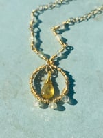 This one of a kind wire wrapped necklace is made with gold wire and chain with a tiny circular wrapped pendant, which contains a tiny green garnet center piece with tiny light green prehnite stones to accent. The necklace measures 18 inches long and closes with a lobster clasp. It’s very light weight and delicate so it’s great for layering of worn by itself. It comes to you gift wrapped!