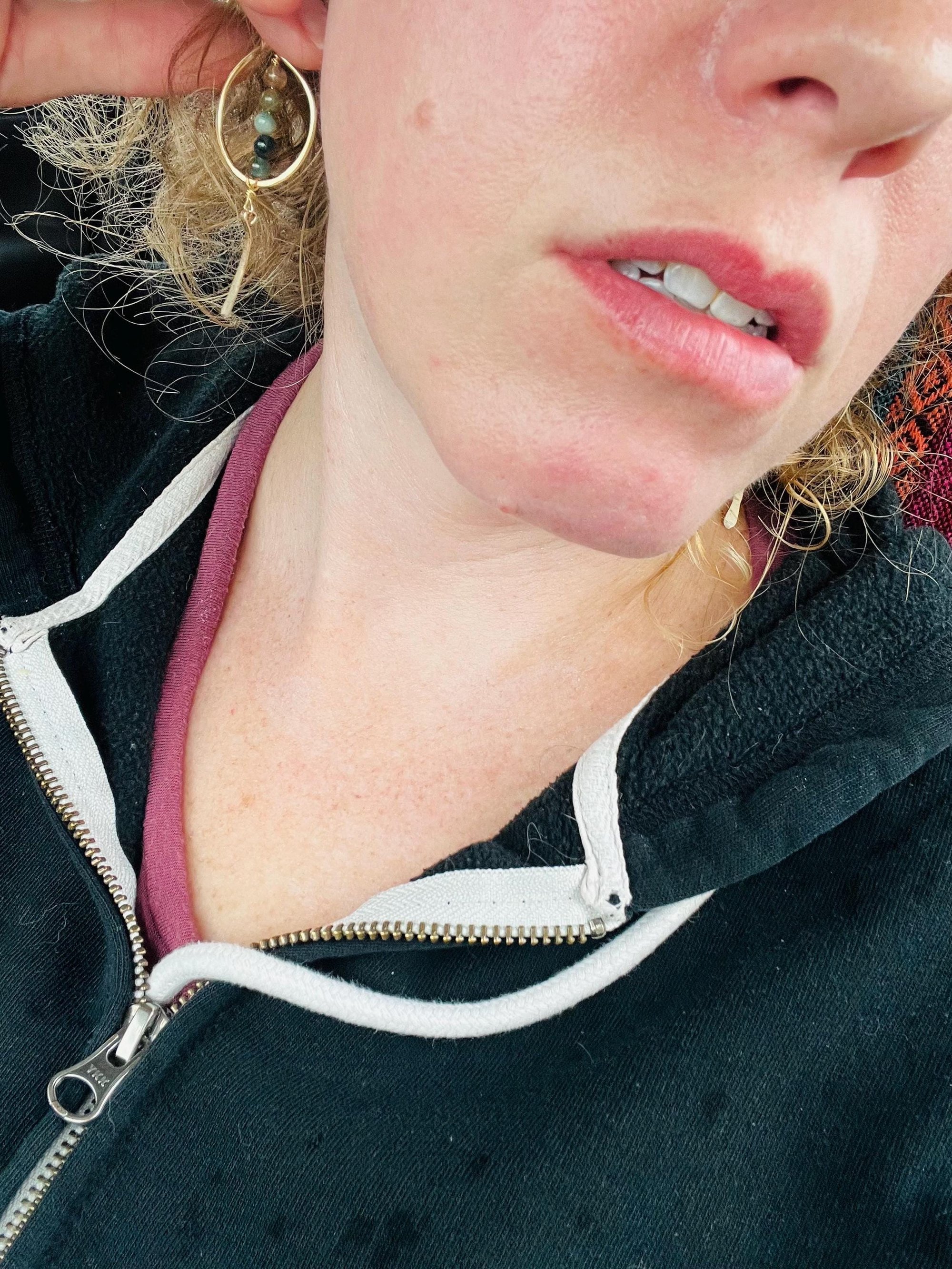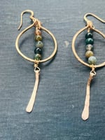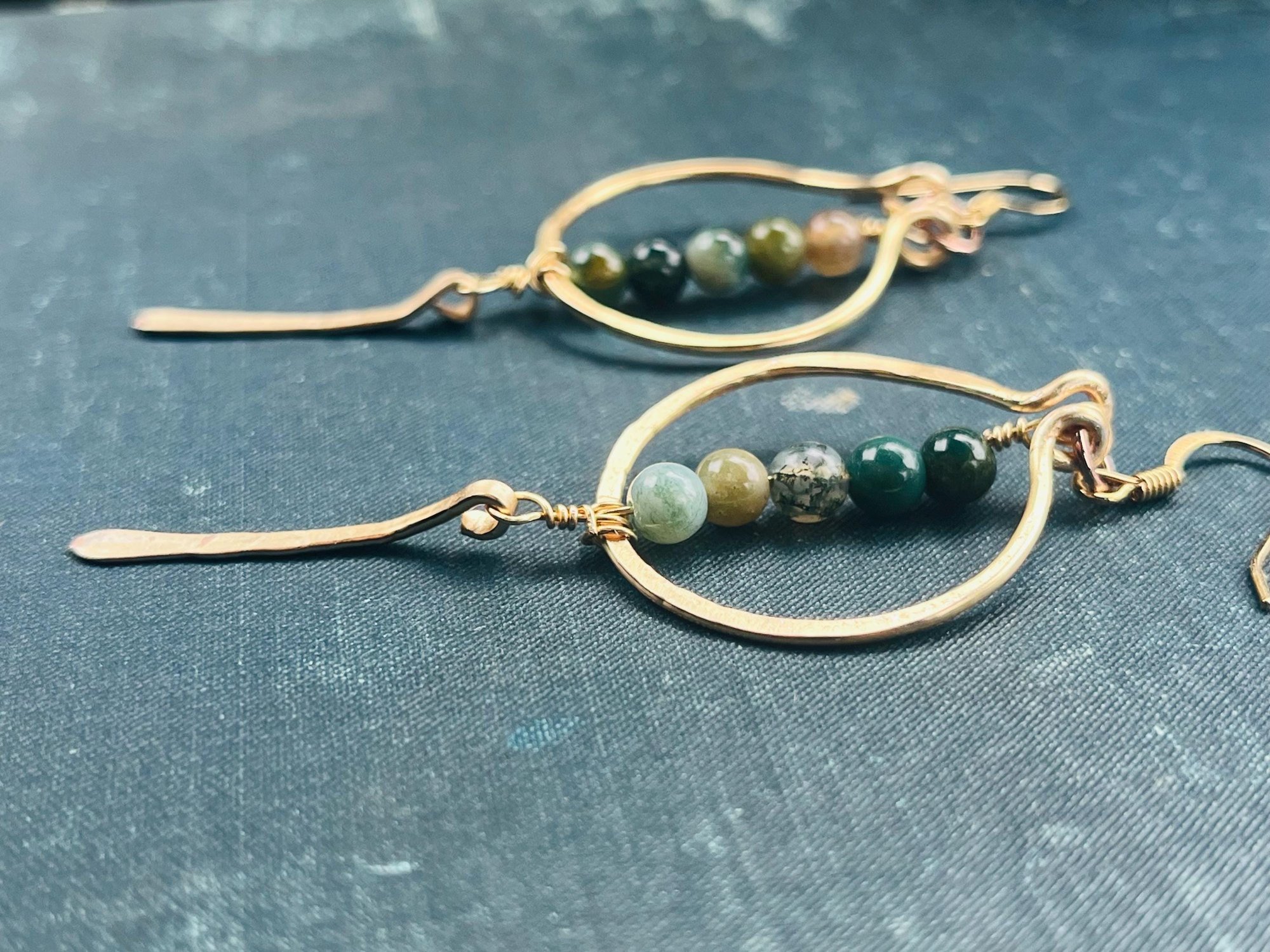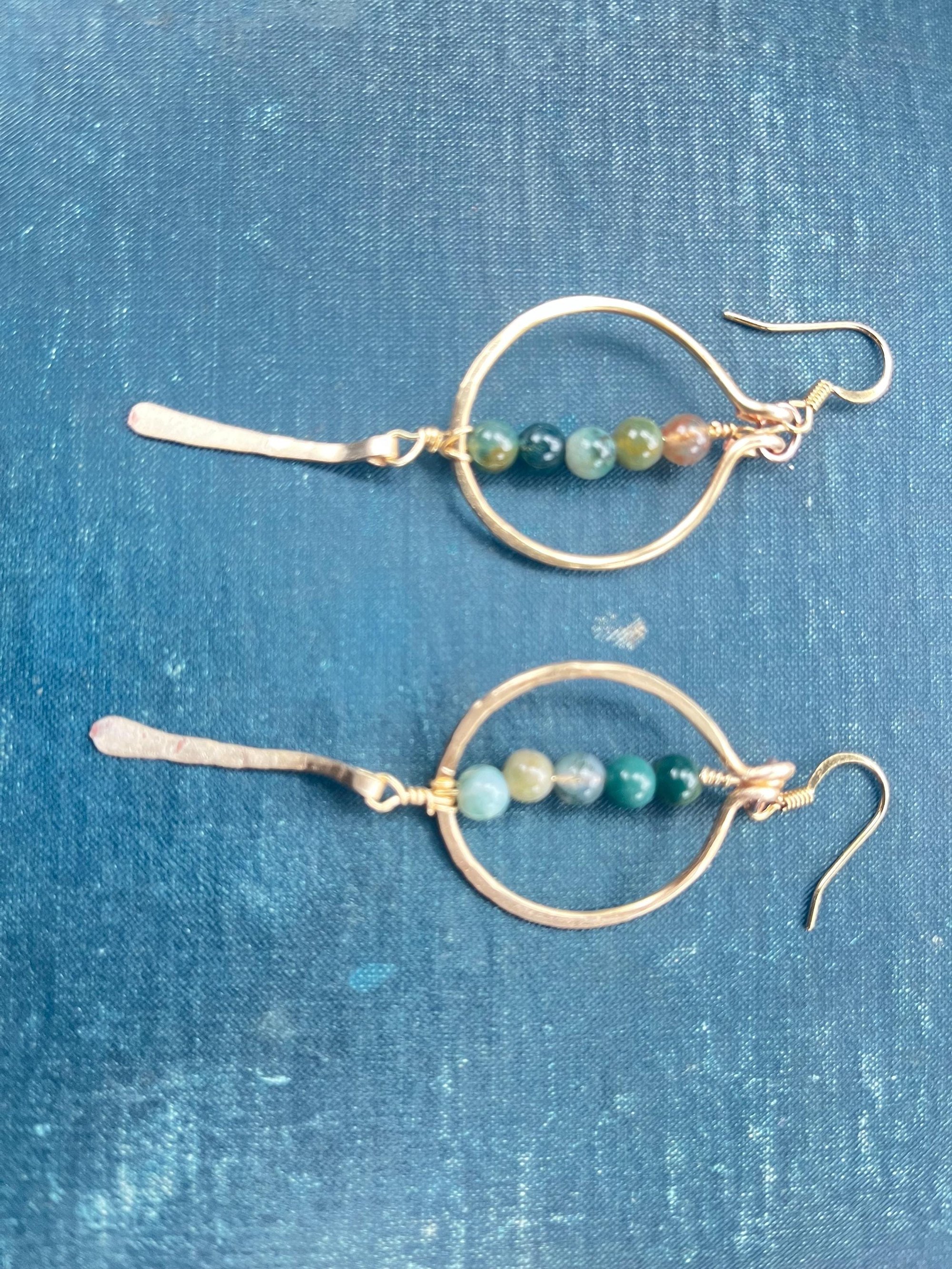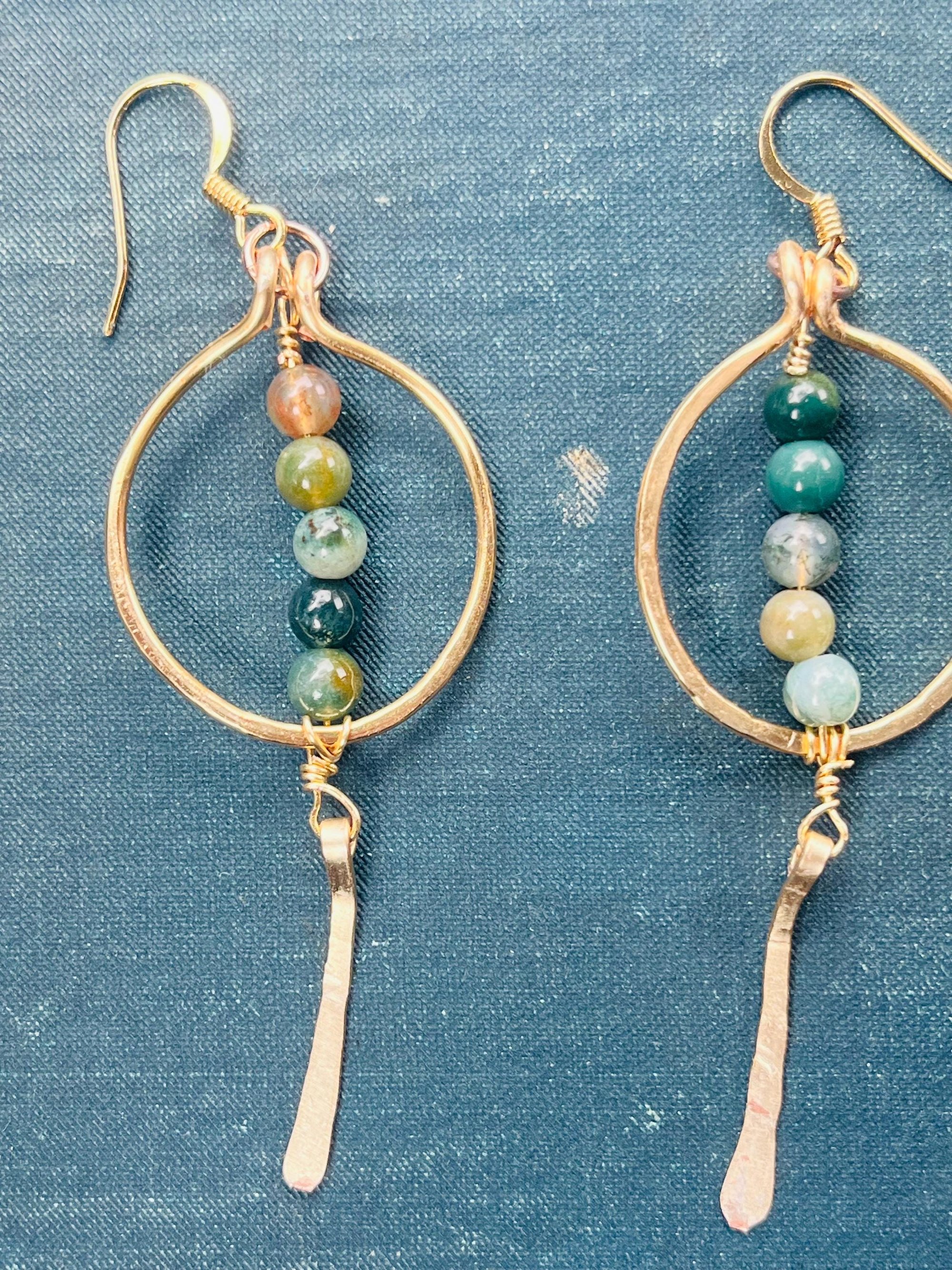 hammered gold wire hoops with multi-colored jasper stones dangle earrings