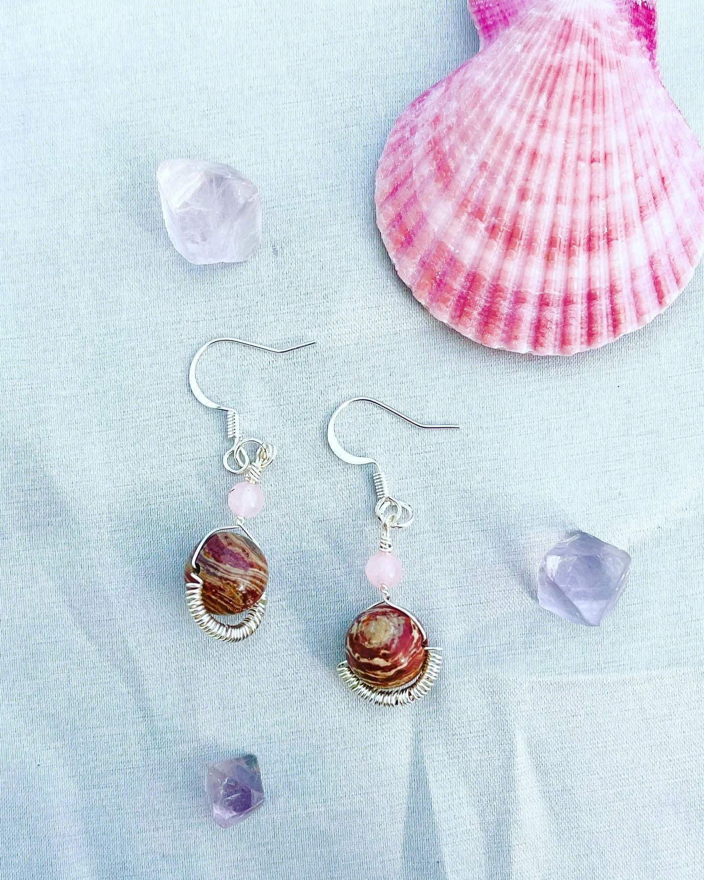 Jasper and rose quartz wire wrapped silver dangle earrings