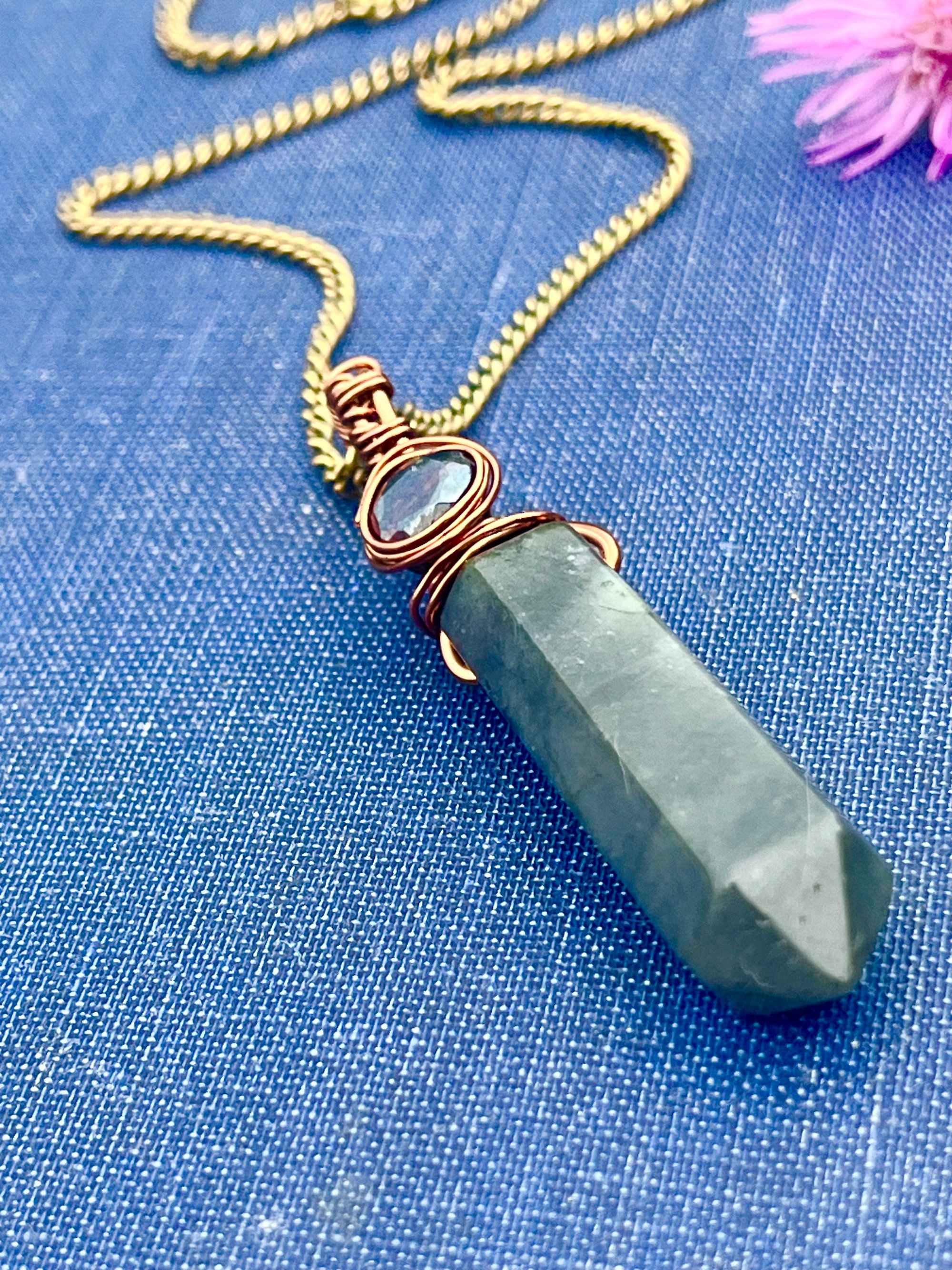 This copper necklace is made with a wire wrapped labradorite pendant with a garnet accent stone. The necklace measures 18 inches long and the pendant measures 2 inches long.