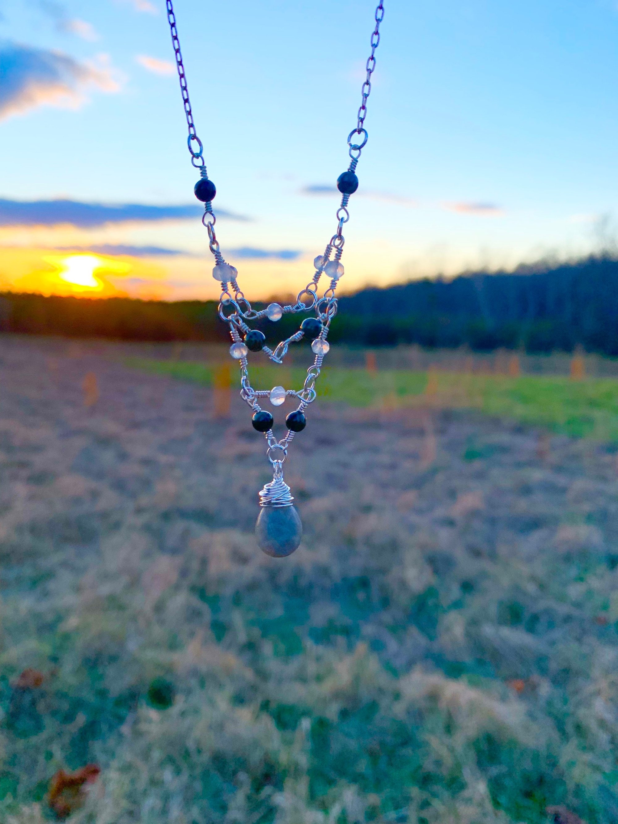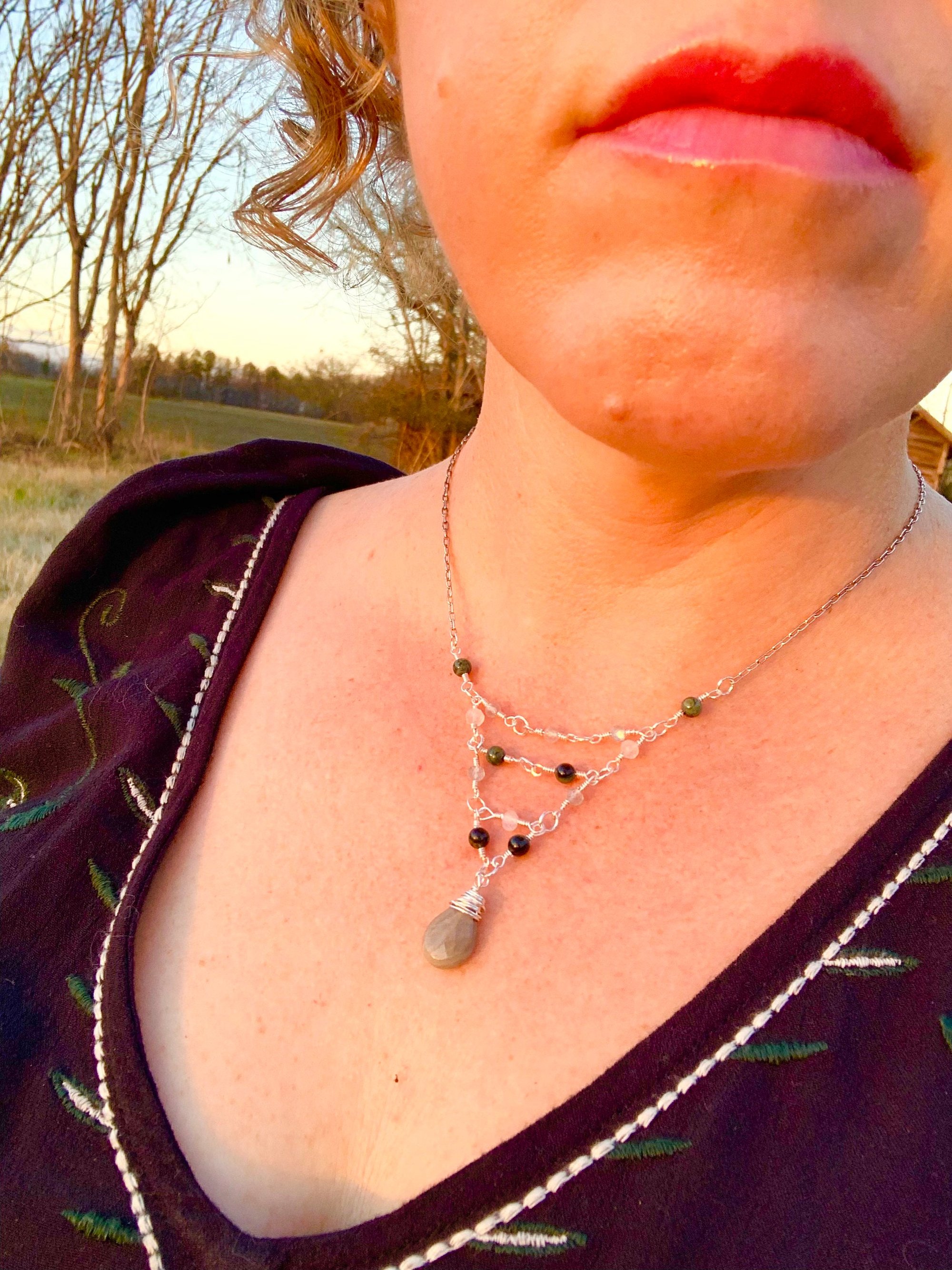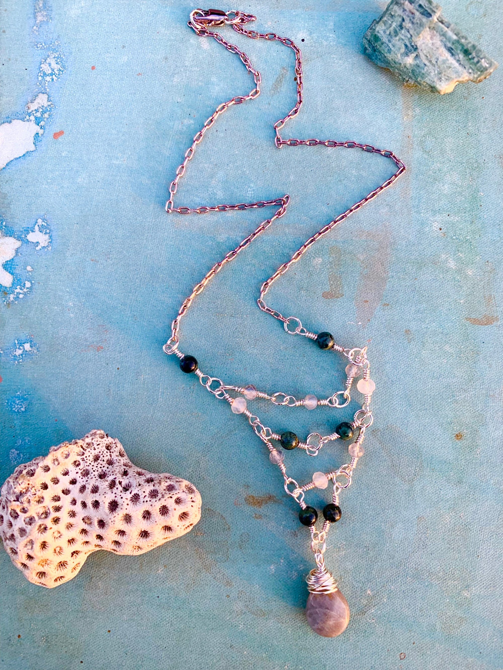 Labradorite, moonstone, and Jasper wire wrapped silver necklace