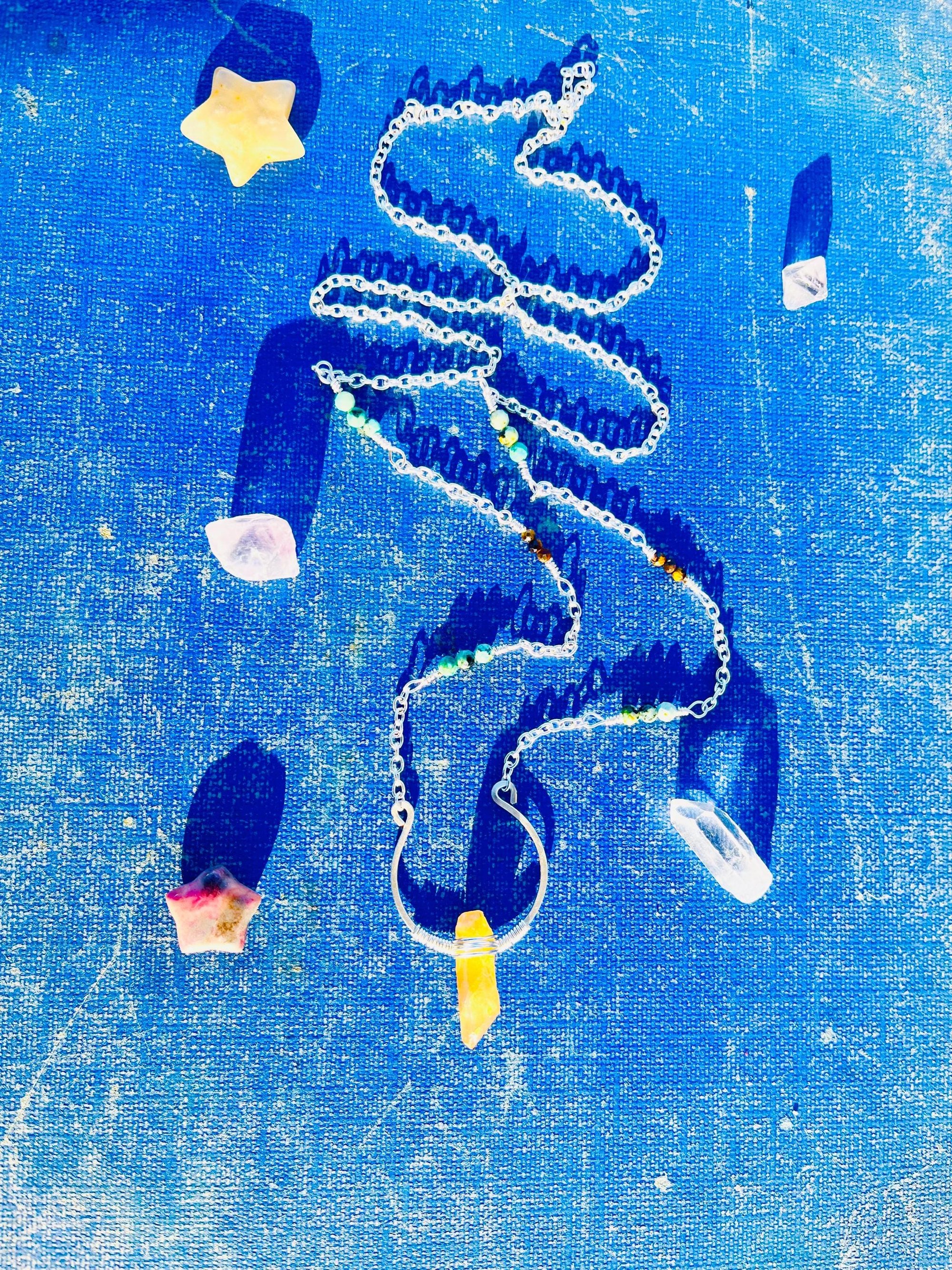 long silver wire wrapped necklace with aura quartz, amazonite, and tigers eye