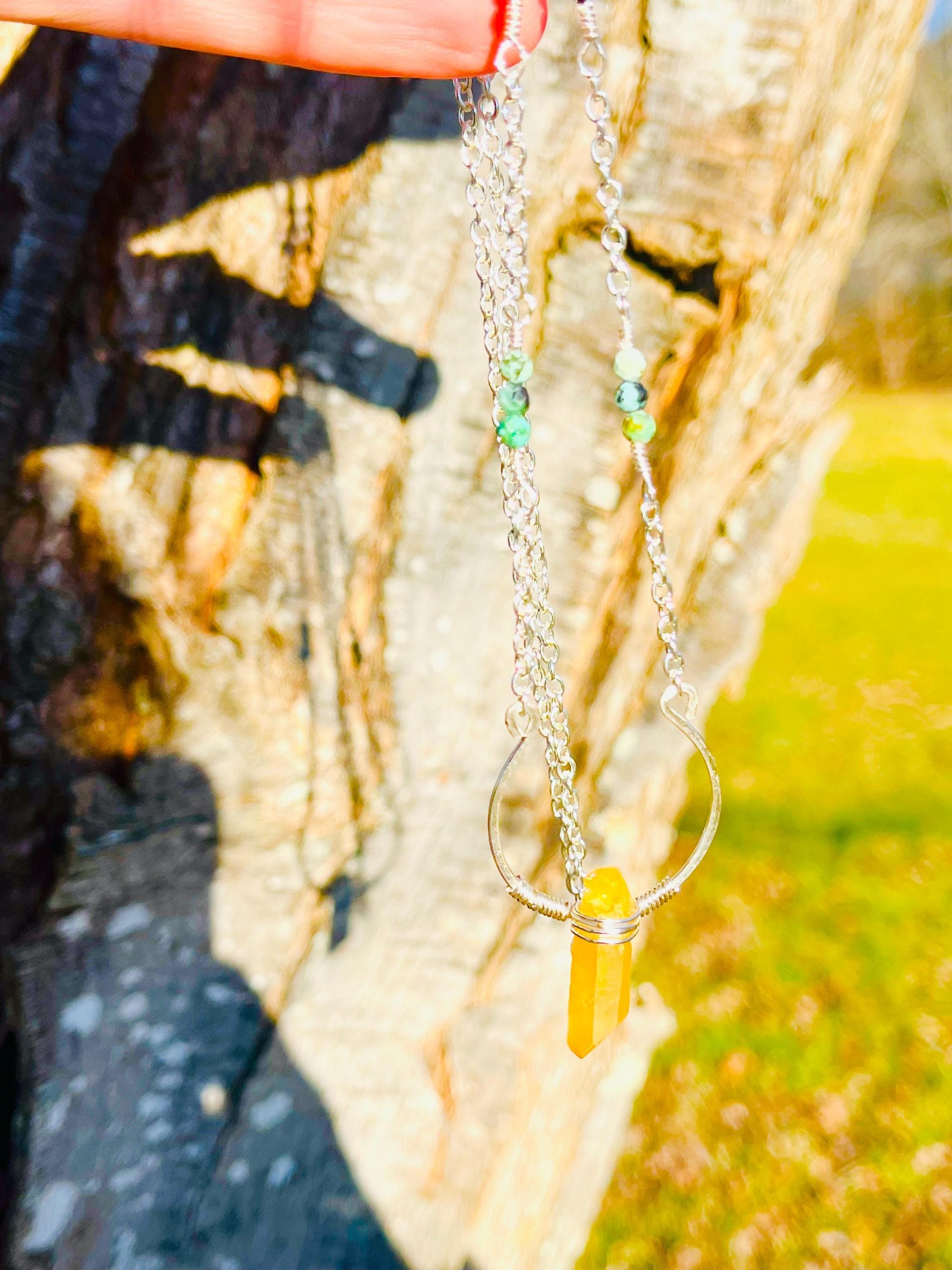 This long necklace is made with silver toned wire and chain which doesn’t tarnish, tigers eye, amazonite, and an aura quartz in the center. It measures 24 inches and comes to you gift wrapped!