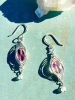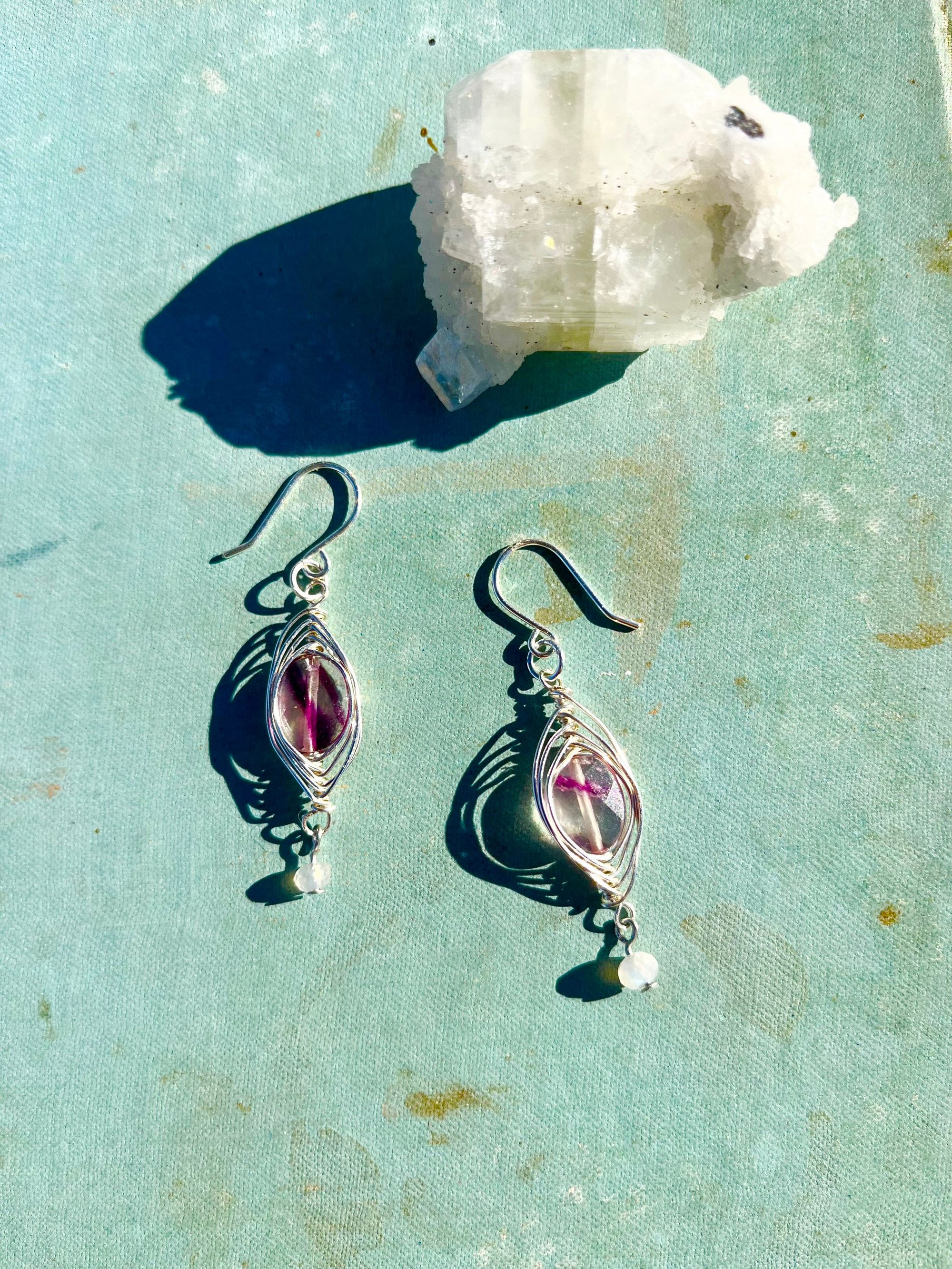 These earrings are made with purple fluorite stones and tiny moonstones wire wrapped in silver wire. They measure 2 inches each.