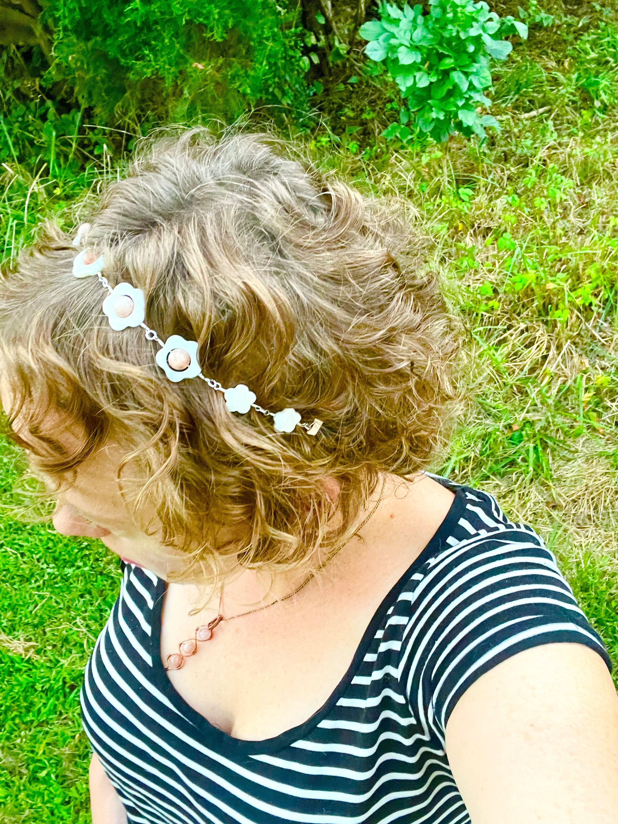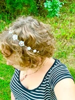 This elastic head band is made with shell flowers and sun stones wire wrapped with silver toned wire. It measures 20 inches, but I can make it shorter or longer if needed.