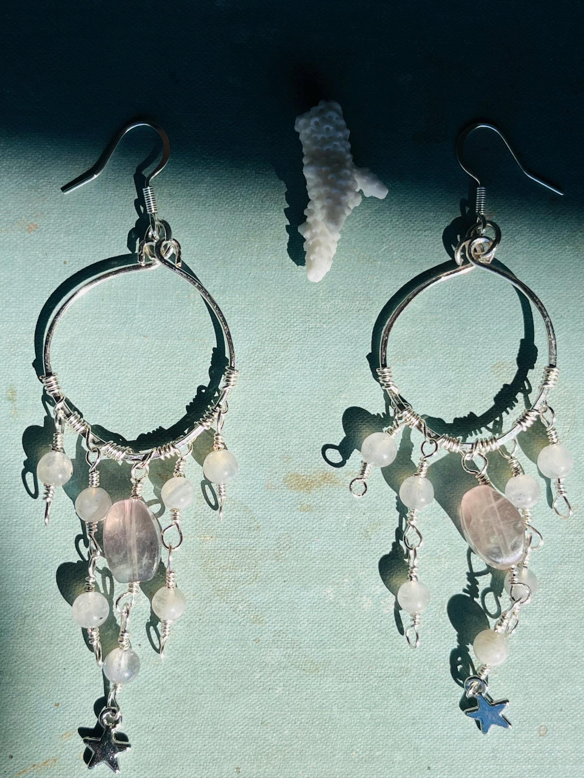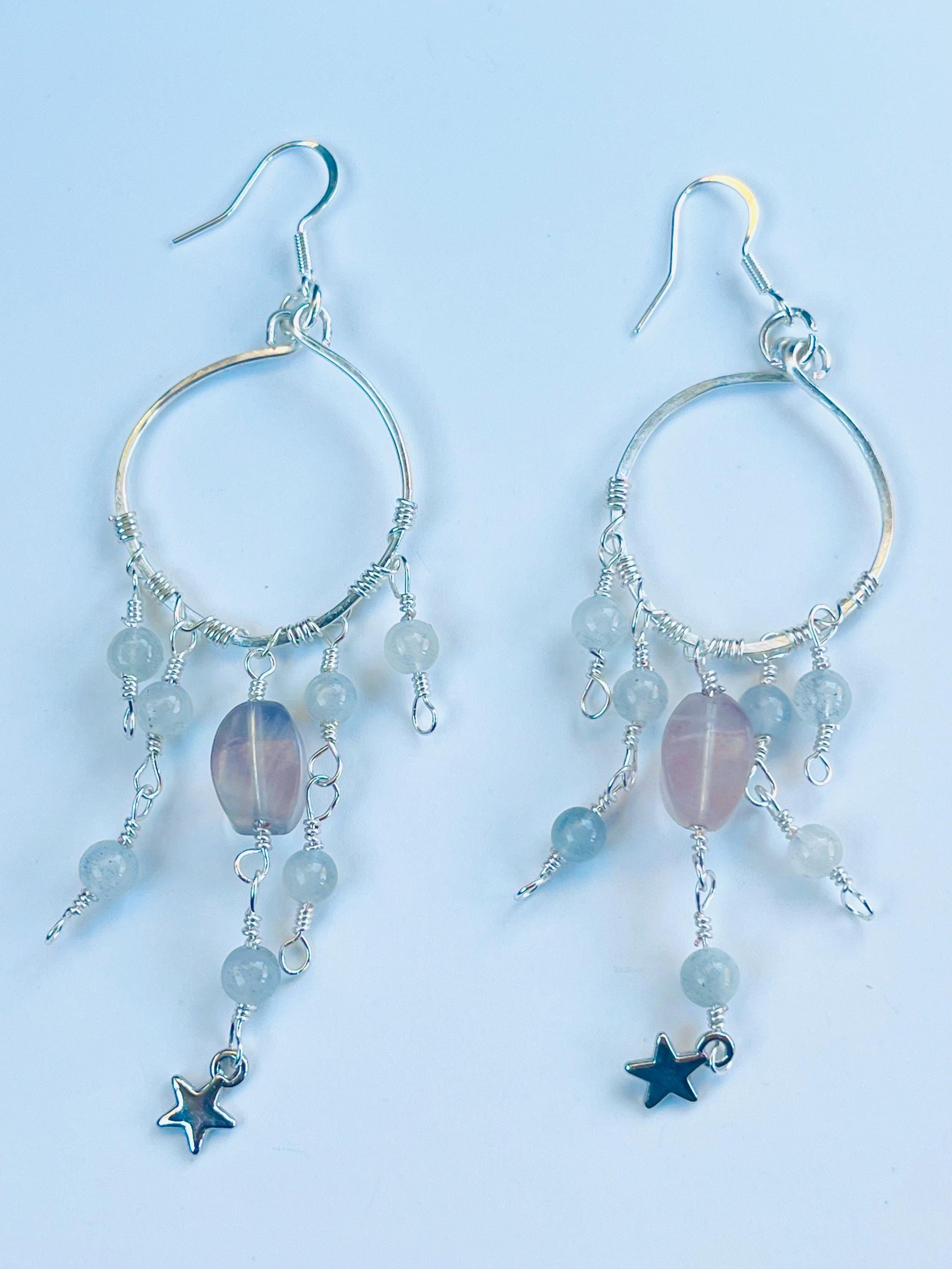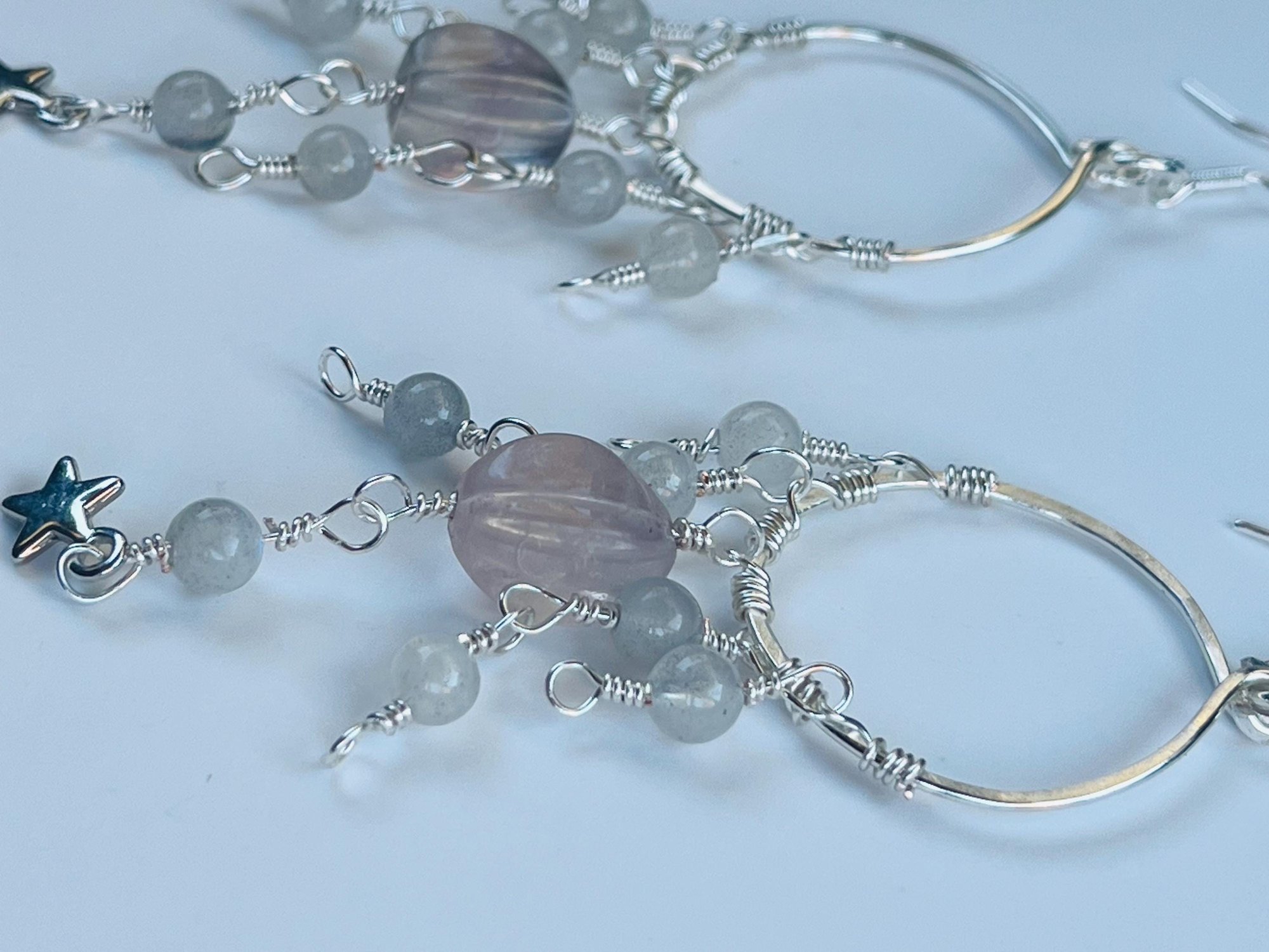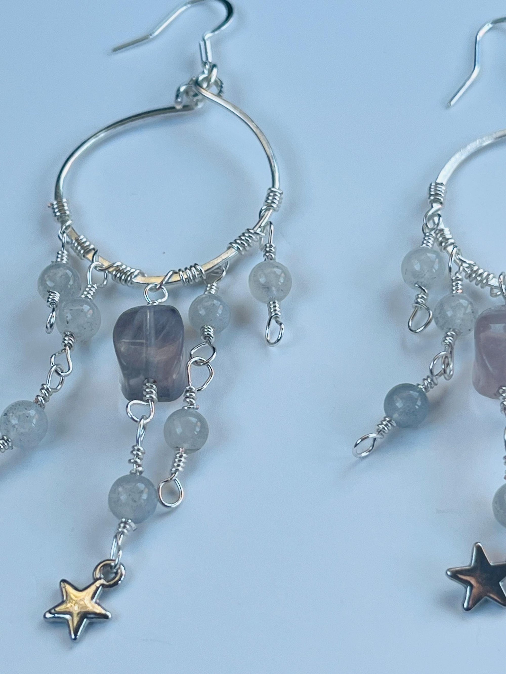 star dangle hoop earrings with fluorite and labradorite in silver