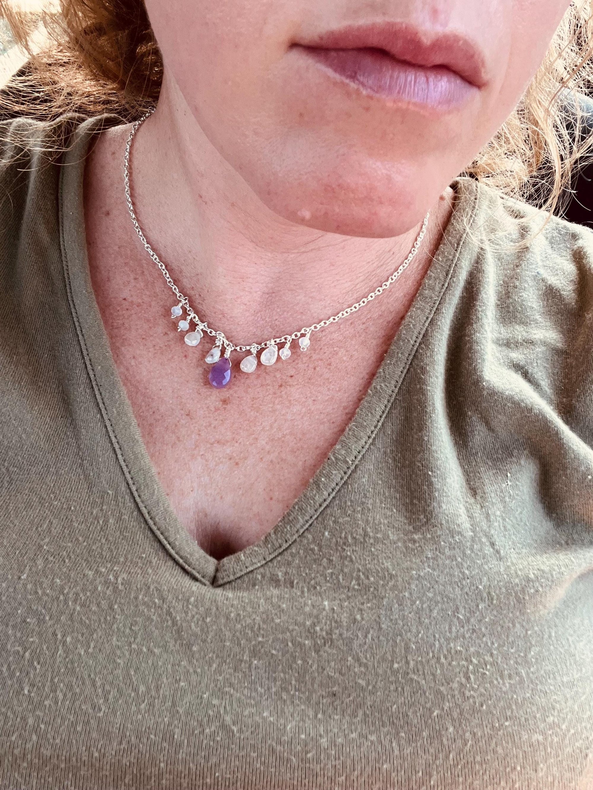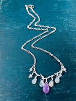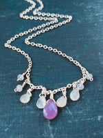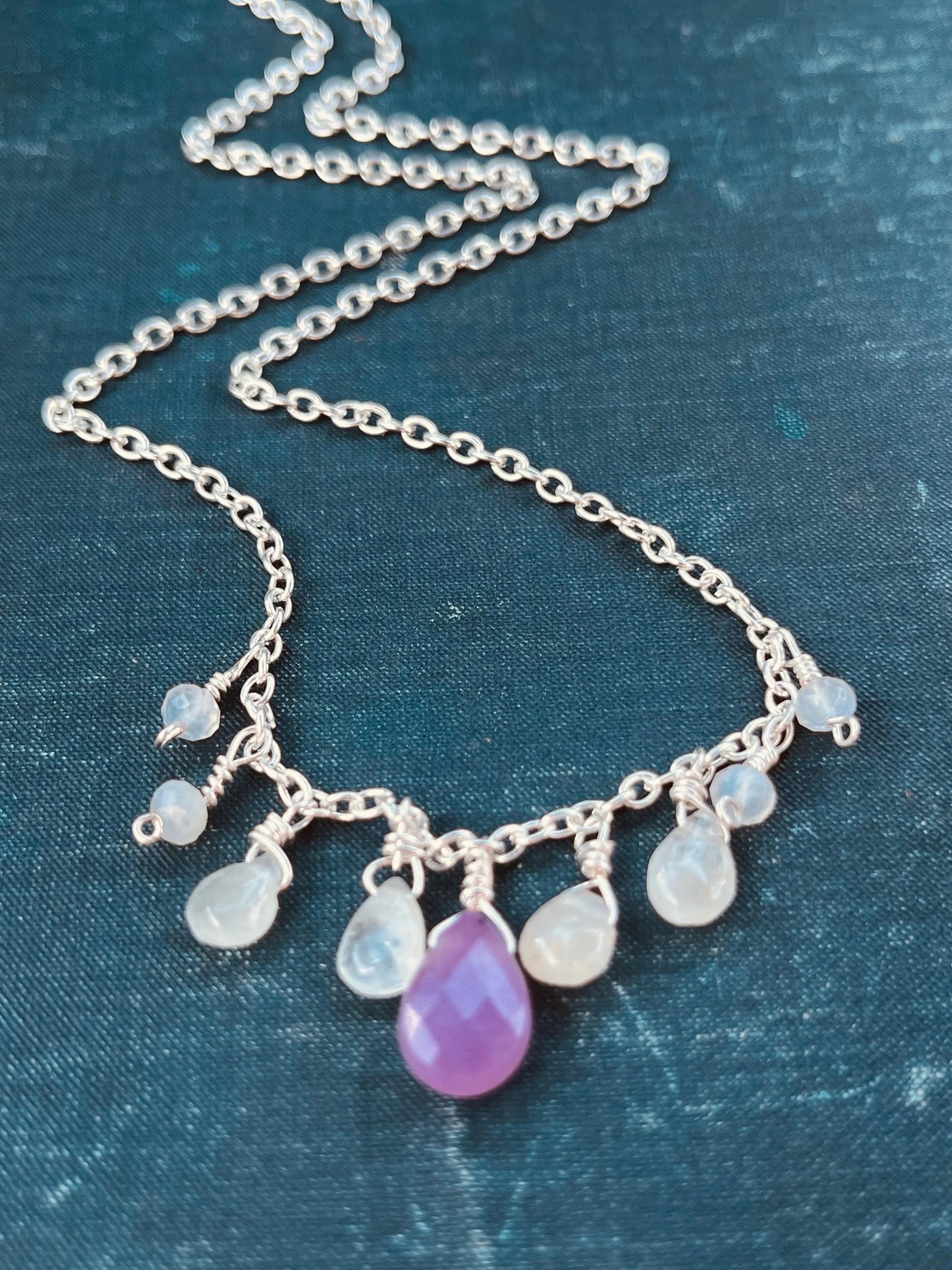 ~silver necklace made with a dyed pink agate stone in the center, tiny aquamarine drops, and round moonstones surrounding. The necklace measures 17 inches long and closes with a handmade hook clasp. It comes to you gift wrapped!~