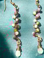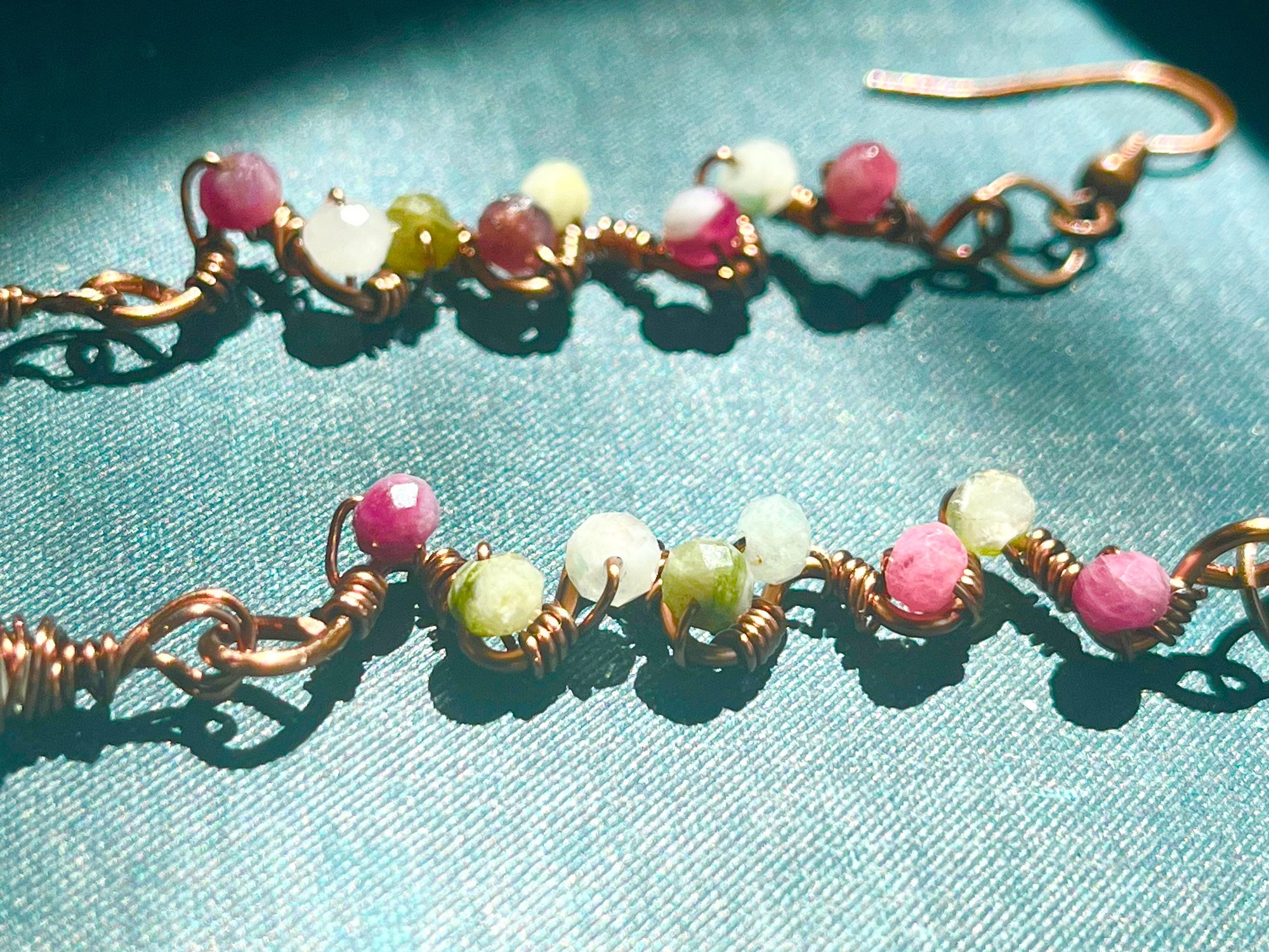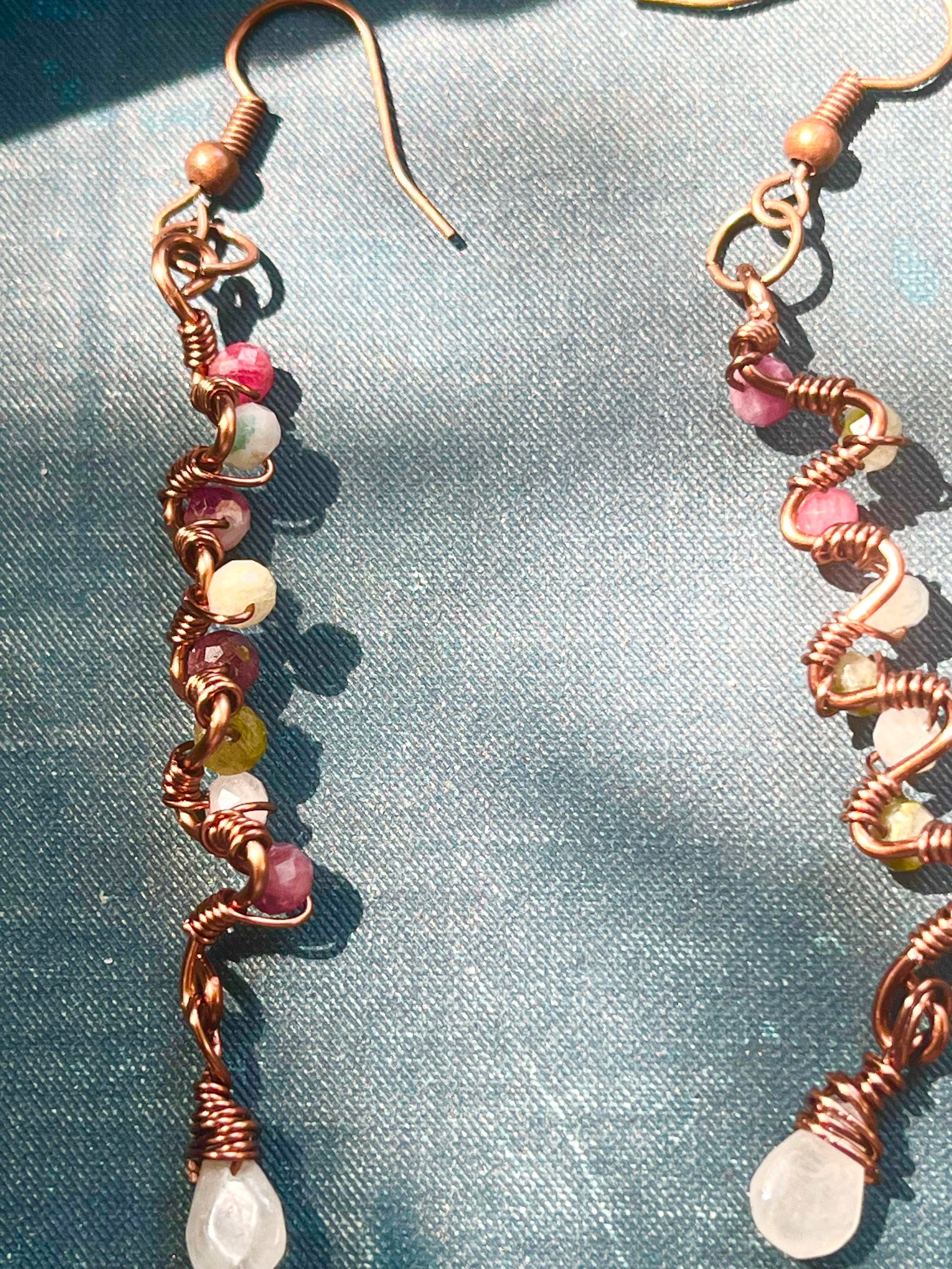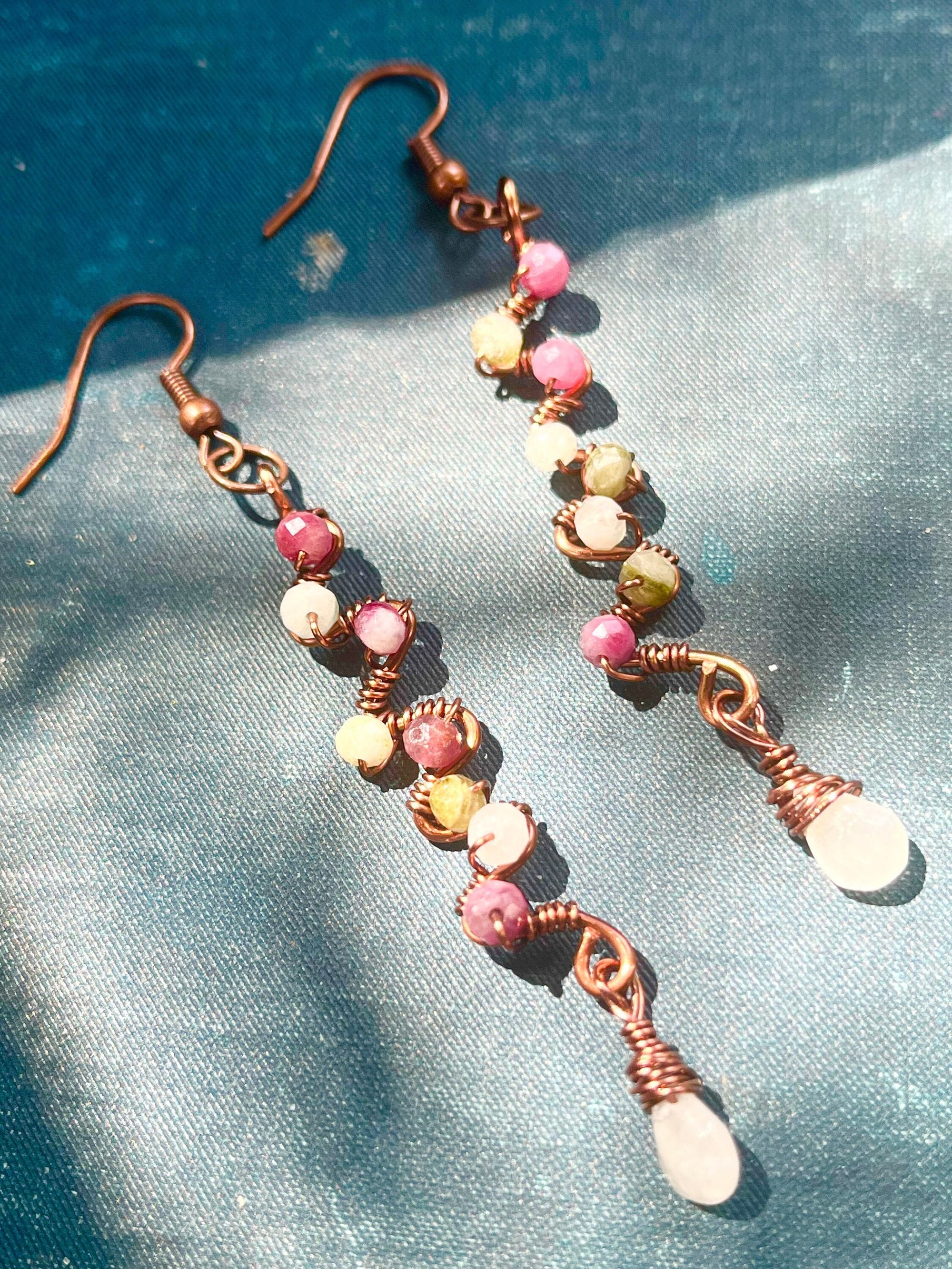 These copper wire wrapped earrings are made with multicolored tourmaline stones and tiny moonstone drops at the bottom. They measure 3 inches each and come to you gift wrapped.