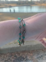 These three beaded bracelets are wire wrapped with antique brass wire and are made with tiny blue glass beads and tiny Pyrite stones. They measure 7 inches each and each close with a lobster clasp.