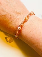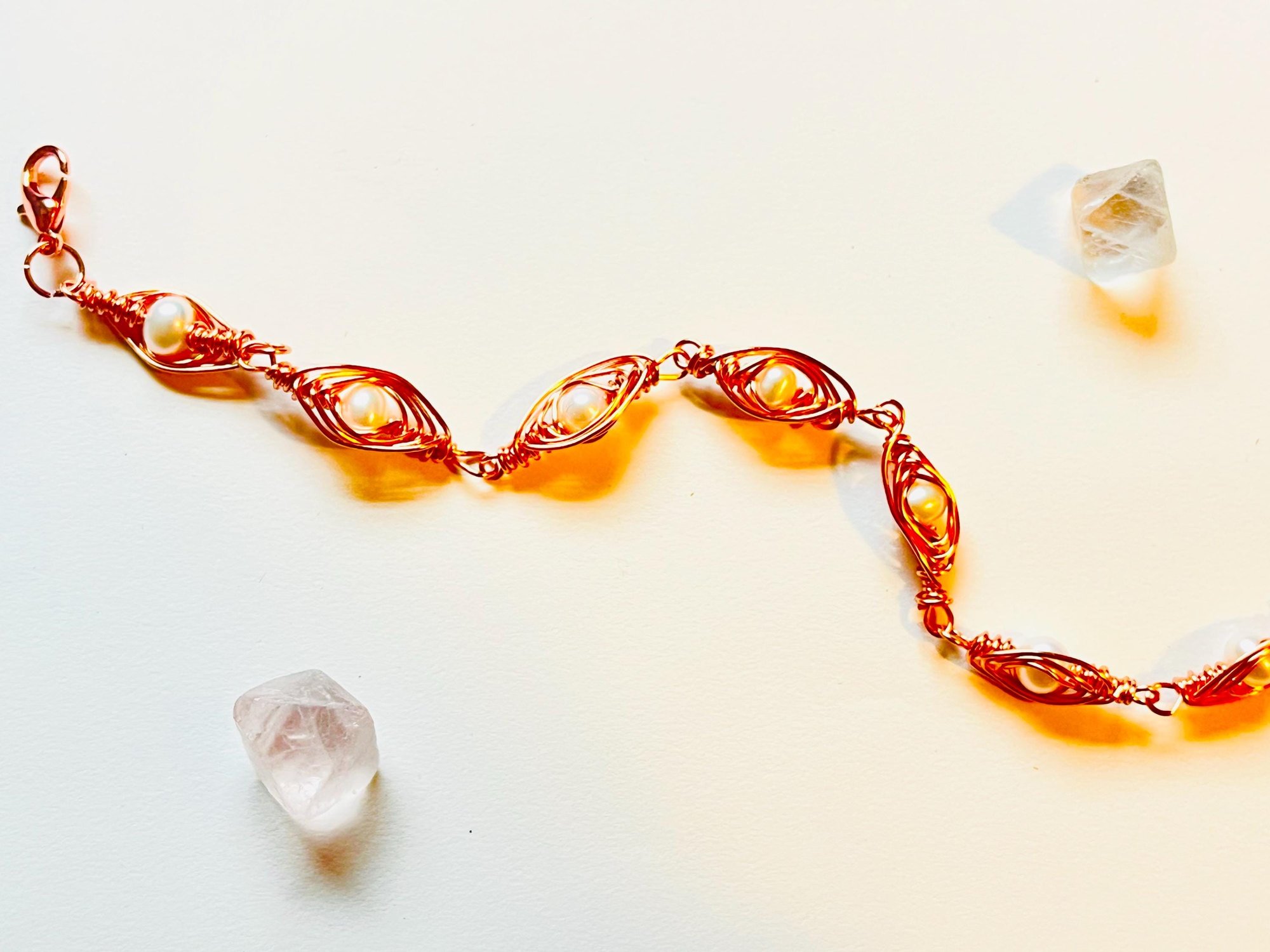 This wire wrapped bracelet is made with freshwater pearls and copper wire. It measures 6 inches long and I can make it longer if needed. It comes to you gift wrapped!