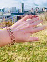 This bracelet is made with three strands of wire wrapped Rose quartz and a single tiny Amazonite star. It measures 7 inches and closes with a lobster clasp.