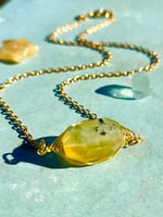 This gold wire wrapped necklace is made with a yellow tourmaline centerpiece and measures 16 inches. It closes with a gold lobster clasp.